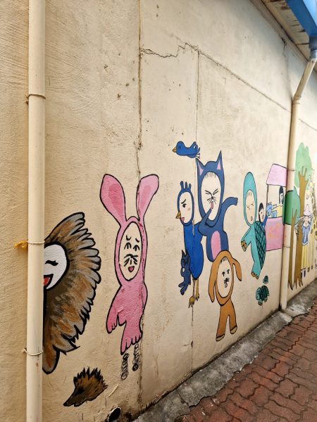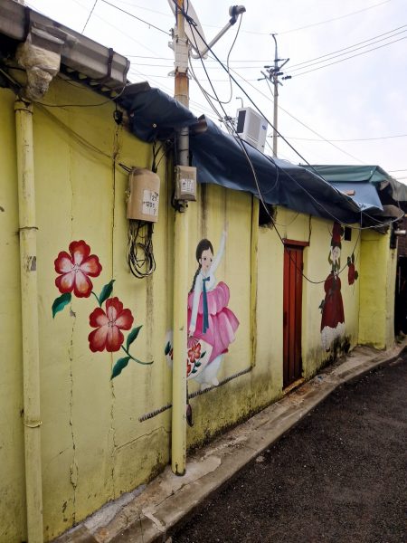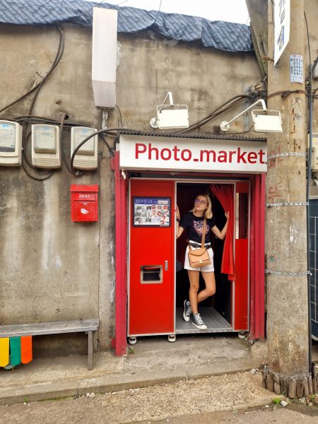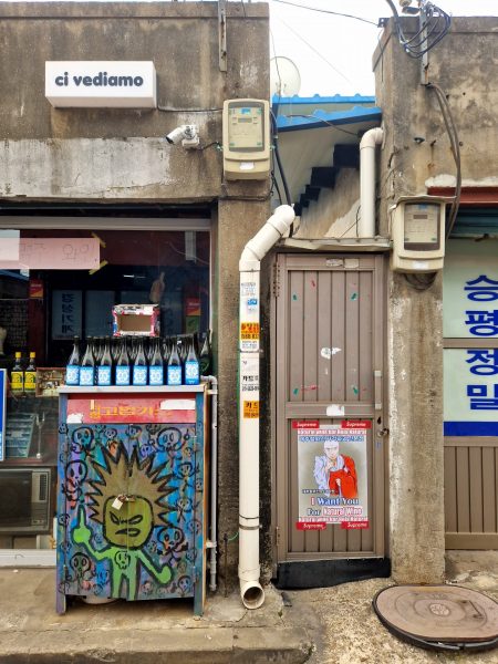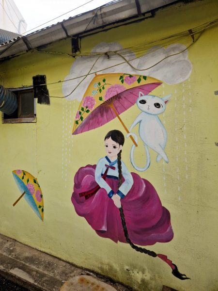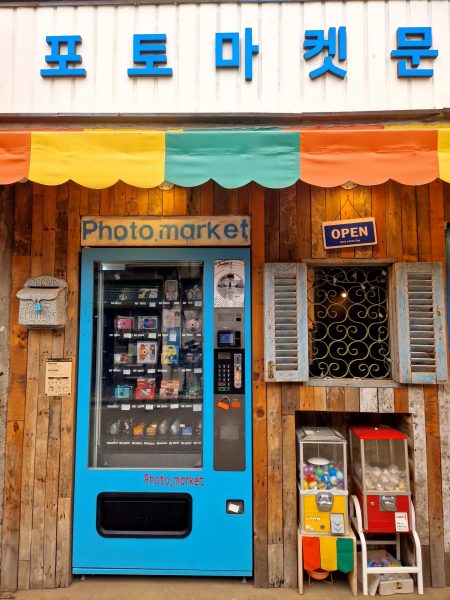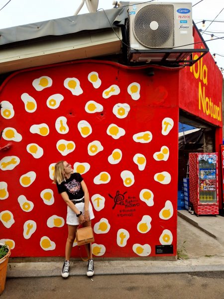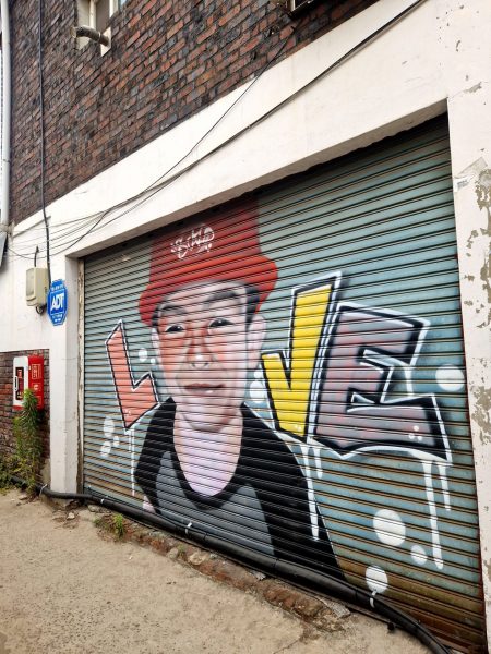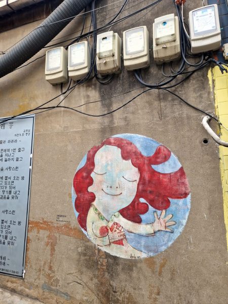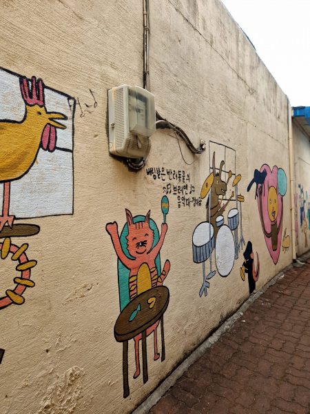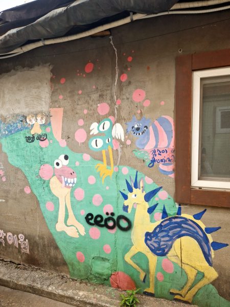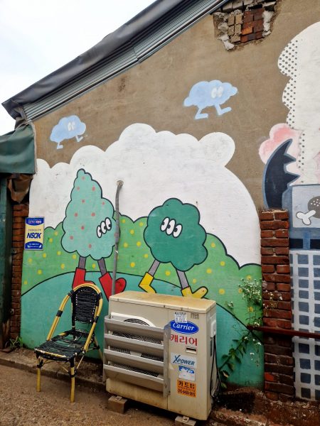 Nous sommes tombées sur des petites dingueries comme cette espèce de studio photo « Photo market » en rouge plus bas en photos. Ca se présente comme un photobooth, puis on tire le rideau et on entre littéralement à l’intérieur, type photobooth que l’on trouve de partout à Séoul avec de quoi se déguiser. Juste à côté se trouve un autre studio avec mêmes des tables, des chaises, des vieilles télés, des chapeaux… On a fait notre meilleur shooting et toujours sans personne qui travaillait là c’était dingue. Bien sûr, le quartier est célèbre pour toutes ses œuvres d’art que l’on trouve de partout comme vous pouvez le voir sur les photos. Certaines sont vraiment travaillées. On a trouvé aussi pas mal de références à BTS c’était chouette.