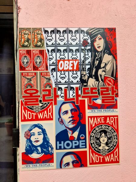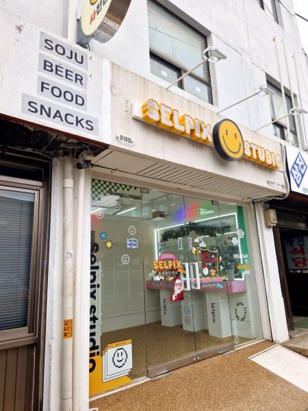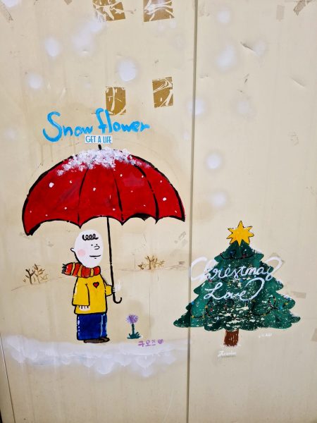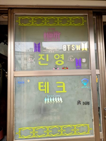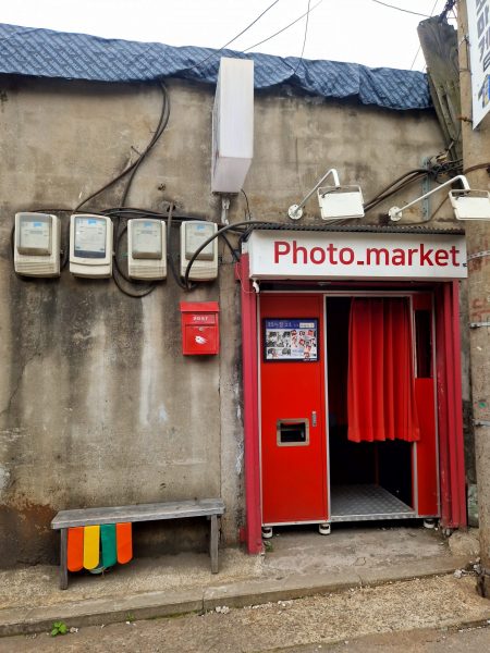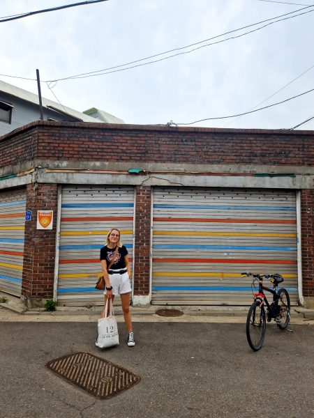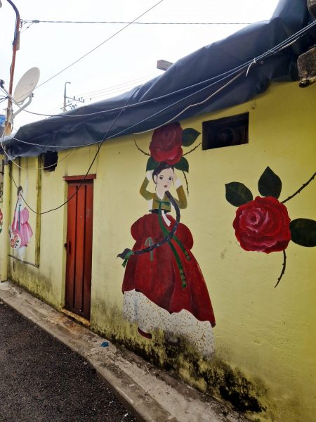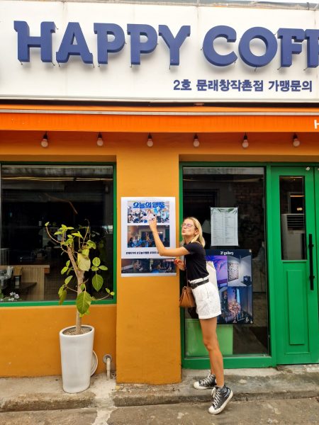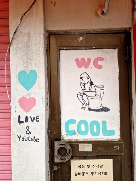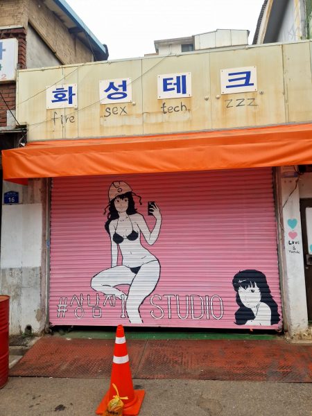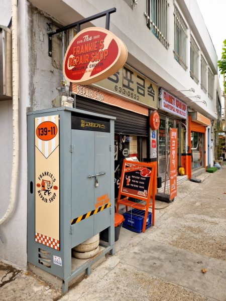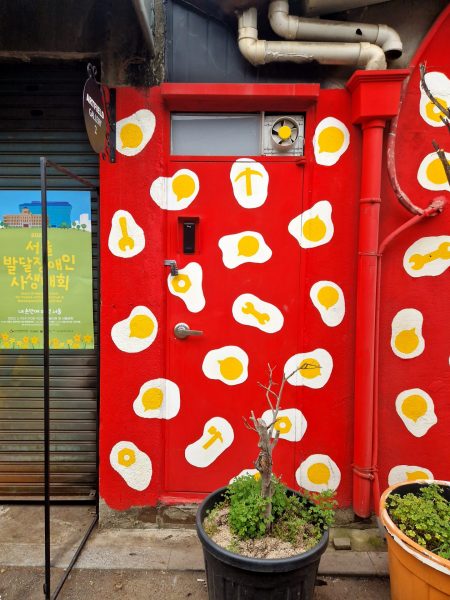 Nous sommes tombées sur des petites dingueries comme cette espèce de studio photo « Photo market » en rouge plus bas en photos. Ca se présente comme un photobooth, puis on tire le rideau et on entre littéralement à l’intérieur, type photobooth que l’on trouve de partout à Séoul avec de quoi se déguiser. Juste à côté se trouve un autre studio avec mêmes des tables, des chaises, des vieilles télés, des chapeaux… On a fait notre meilleur shooting et toujours sans personne qui travaillait là c’était dingue. Bien sûr, le quartier est célèbre pour toutes ses œuvres d’art que l’on trouve de partout comme vous pouvez le voir sur les photos. Certaines sont vraiment travaillées. On a trouvé aussi pas mal de références à BTS c’était chouette.