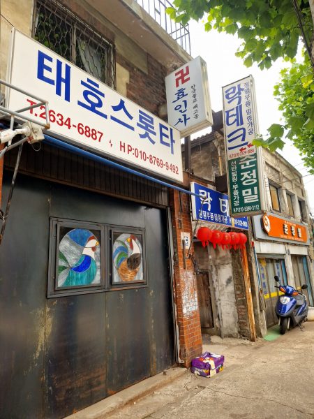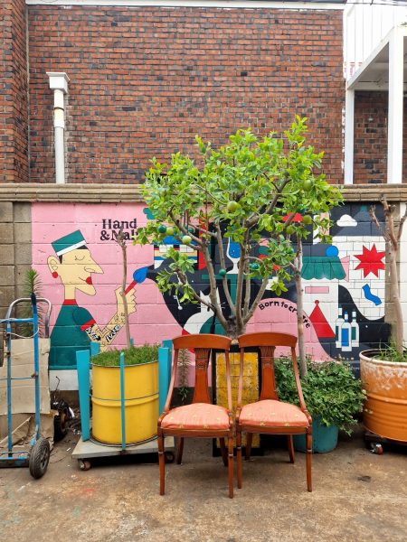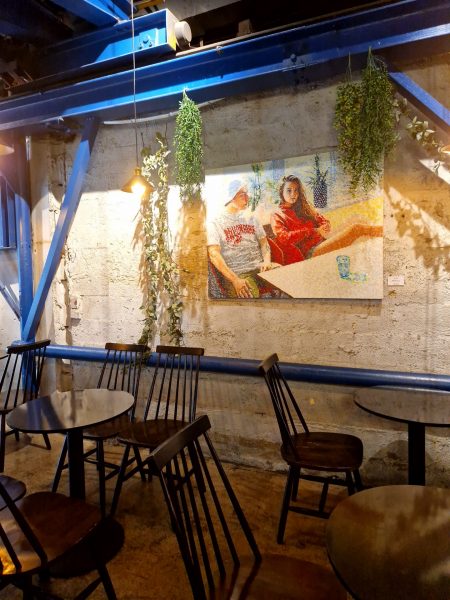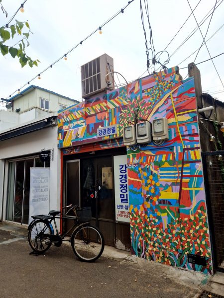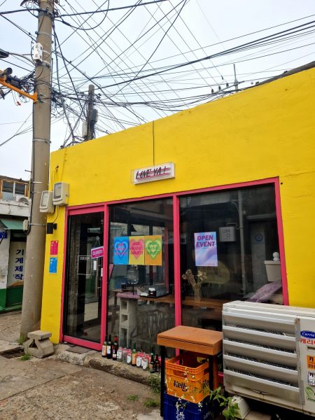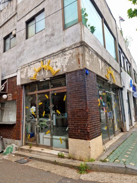 Déjà pour arriver dans cette partie située entre les stations Mullae et Sindorim, situées sur la ligne verte la 2, sortez idéalement à la sortie 1 ou à la 7 à Mullae station et continuez tout droit. En direction de Sindorim dans le sud. La partie la plus intéressante à voir est appelée le Mullae Arts village. Baladez vous dans les rues, vous y trouverez des petites galeries, dont certaines que j’avais repérées, ( la dernière photo). Certaines sont ouvertes tout le temps comme une avec personne qui ne travaillait à l’intérieur, chose peu rare en Corée du sud, ou d’autres qui ont des horaires comme partout. D’ailleurs pour l’une d’entre elles, un homme nous a vues attendre devant, et nous a ouvert. Vraiment très sympa. Vous tomberez sur des petits cafés ou bien de plus grandes structures comme le Old mullae, Hof bar type pub, où je m’étais rendue un soir, ou encore le Verde coffee, qui propose des boissons type café et également des brunchs. On y trouve aussi quelques boutique type petits créateurs, chose qu’il manque cruellement dans le reste de la ville je trouve, au détriment de grandes enseignes type Spao et de la cacaille que l’on trouve à Hongdae. Difficile de trouver ce genre de petite marque c’était donc super appréciable d’en trouver là-bas: bijoux, bougies, savons… Il y a aussi des cafés, des restaurants, j’avais repéré un très bon ramen que je vous conseille vivement, le Roramen. Cependant, faites d’abord un check de ce que vous avez envie de voir sur Kakaomaps ou autre appli type GPS pour vérifier les horaires. Car ces fameuses petites boutiques de créateurs étaient fermées le seul jour où nous y sommes allées. Un lundi si je me souviens bien.