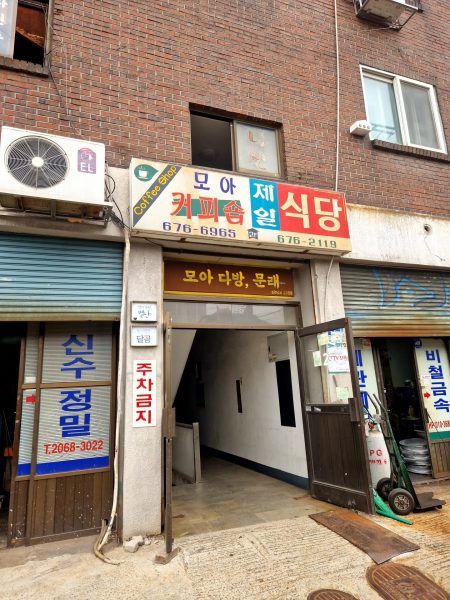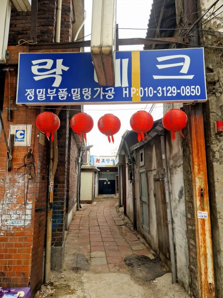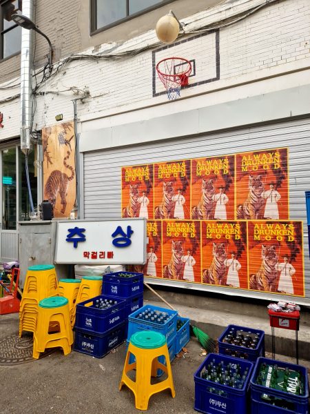 Le quartier est toujours important dans l’industrie avec plus de 100 studios et 300 artisans qui continuent de travailler. Pas mal nous regardaient d’ailleurs curieusement en se demandant ce que nous faisions dans le coin. Si vous restez que dans certaines rues effectivement on pourrait se poser la question, mais après avoir pas mal ratissé, on comprend vite la particularité et l’intérêt de ce quartier vraiment unique en son genre. Toutes les personnes qui s’y sont rendues ont beaucoup aimé l’ambiance, qui change du reste de la ville. J’apprécié qu’ils aient fait des efforts afin de dynamiser le quartier, le rendre attractif de par l’art, et la création d’endroits trendy type bars, cafés, sans pour autant que cela devienne trop populaire. Un savant mélange d’ancien avec une pointe de modernité. La seconde photo devant laquelle je pose fièrement a servi de décor à une des scènes du drama Today’s webtoon. Beaucoup trop cool.