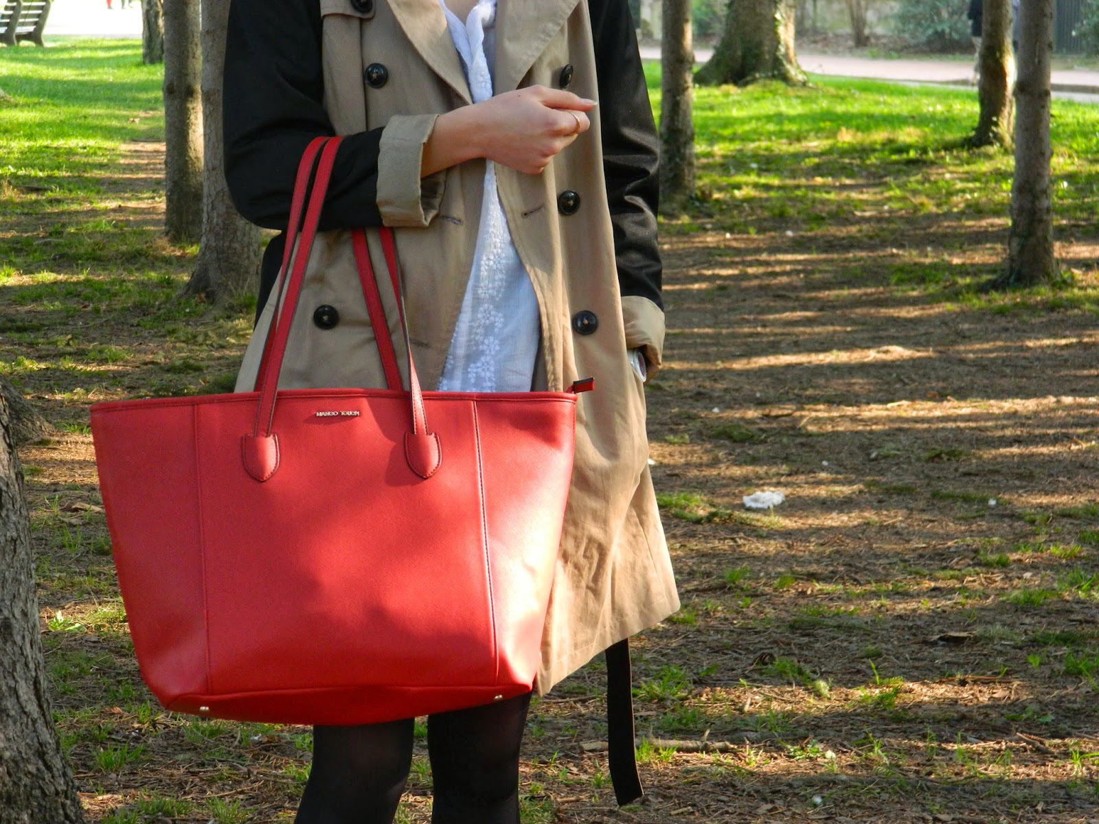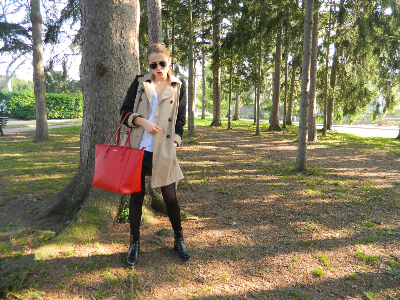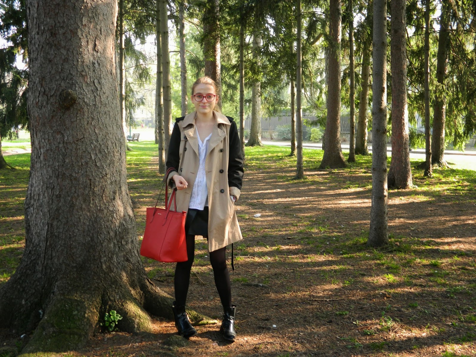 Une blouse blanche, mes bottines noires et mon trench pour un jour bien ensoleillé et agréable, tout ça immortalisé par Lucie.