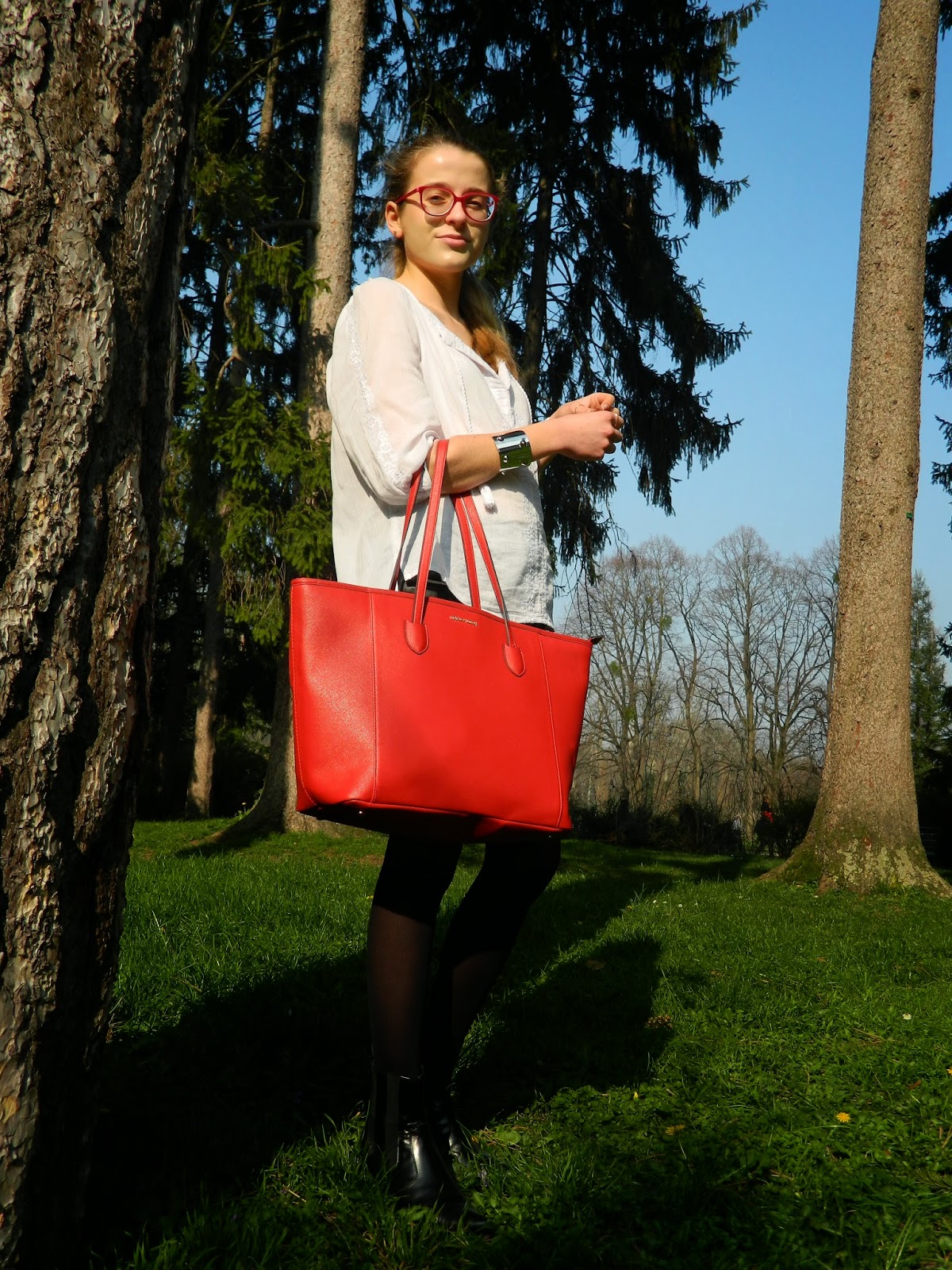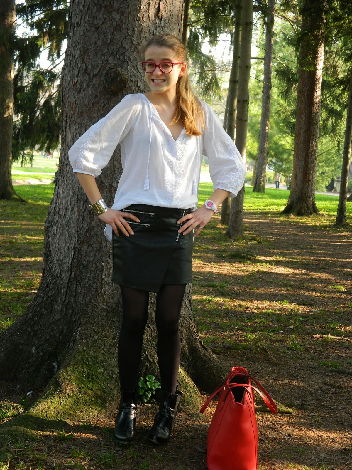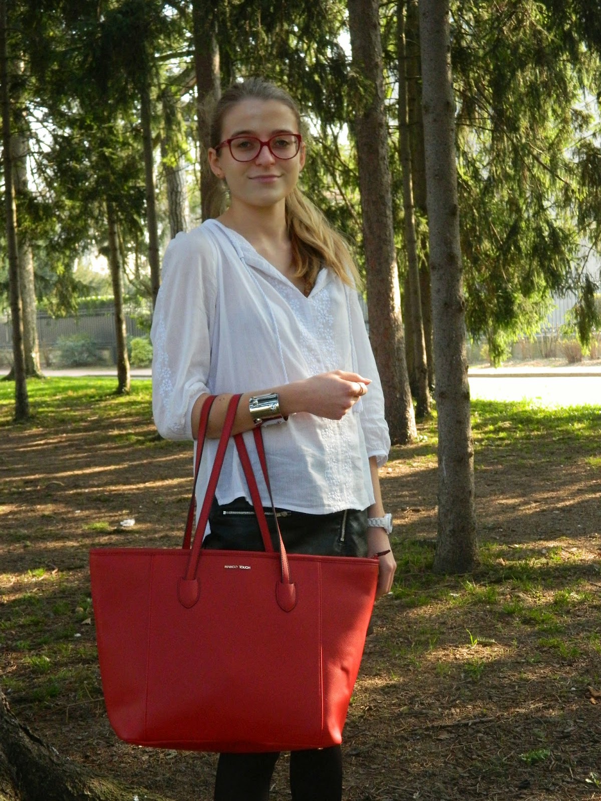 Un nouveau look aujourd’hui avec deux nouveautés. Tout d’abord ma jupe H&M. Je l’avais repérée depuis Septembre cette jupe motarde, mais au bout d’un moment, impossible de mettre la main dessus. Je l’ai laissée passer, mais heureusement, elle est vite ressortie. Quasiment identique. J’aime vraiment beaucoup cette jupe avec sa coupe asymétrique, ses zips. L’autre nouveauté inratable est ce sac rouge Mango. Je vous avais parlé de ces sacs par là, et effectivement les suppositions de Marine étaient bonnes. En tout cas pour le rouge. Peut être pour le noir aussi, vous verrez ça le moins prochain. Comme je le disais dans l’article sur ces sacs, j’ai adoré la forme, les couleurs et le prix. Très grand, ce qui est de plus en plus rare à trouver pour des sacs, je l’adore.