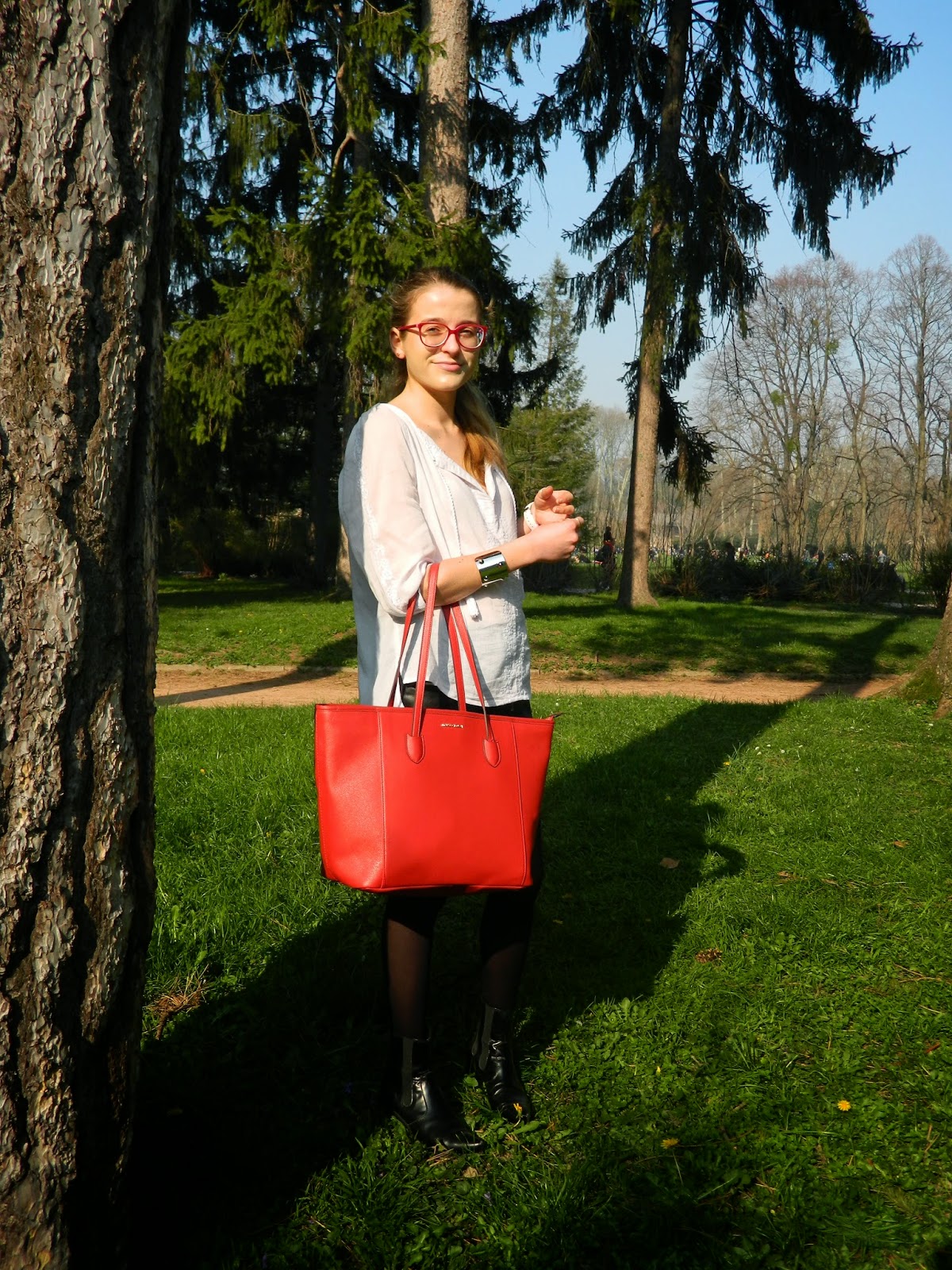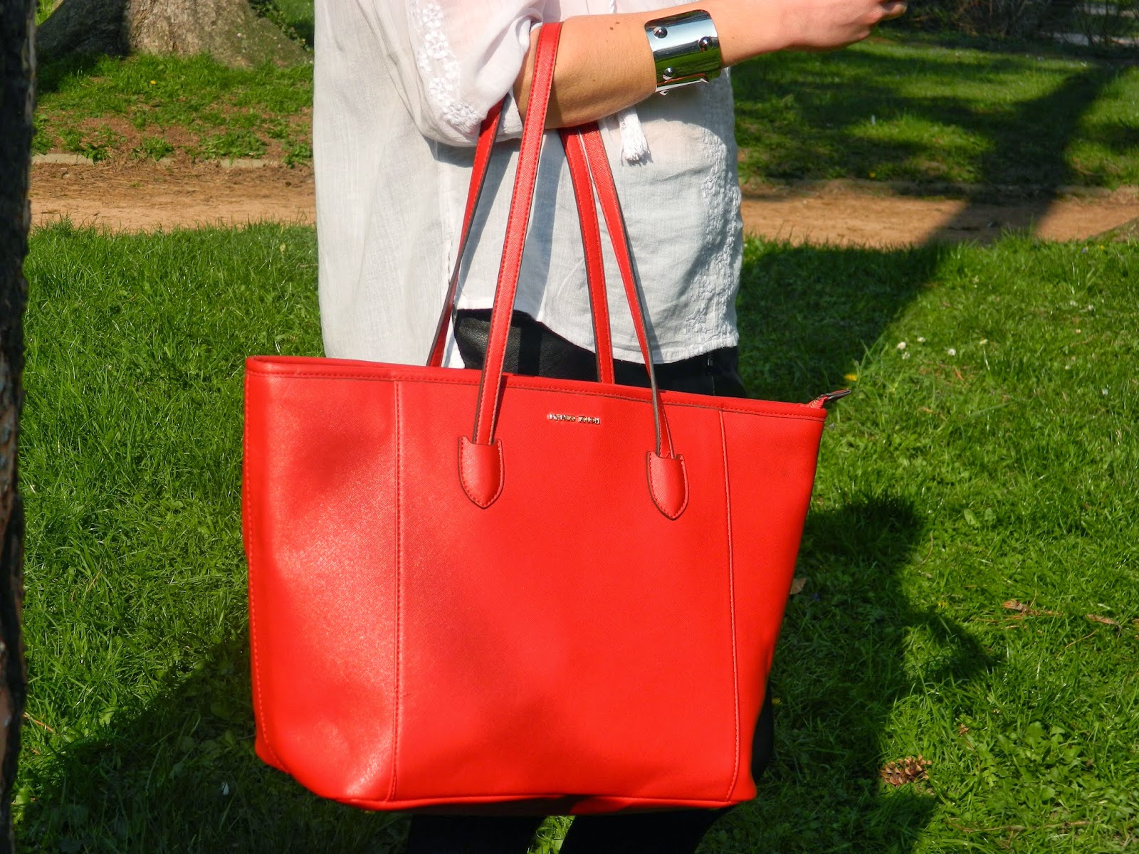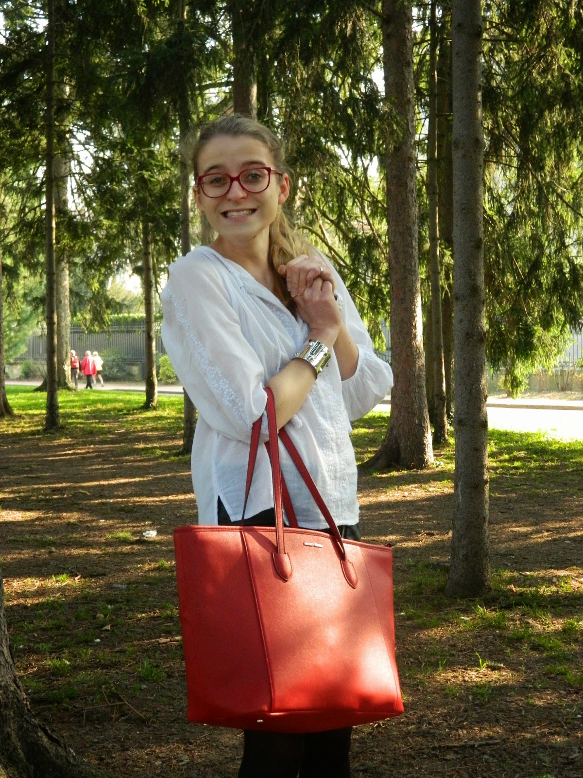 Un nouveau look aujourd’hui avec deux nouveautés. Tout d’abord ma jupe H&M. Je l’avais repérée depuis Septembre cette jupe motarde, mais au bout d’un moment, impossible de mettre la main dessus. Je l’ai laissée passer, mais heureusement, elle est vite ressortie. Quasiment identique. J’aime vraiment beaucoup cette jupe avec sa coupe asymétrique, ses zips. L’autre nouveauté inratable est ce sac rouge Mango. Je vous avais parlé de ces sacs par là, et effectivement les suppositions de Marine étaient bonnes. En tout cas pour le rouge. Peut être pour le noir aussi, vous verrez ça le moins prochain. Comme je le disais dans l’article sur ces sacs, j’ai adoré la forme, les couleurs et le prix. Très grand, ce qui est de plus en plus rare à trouver pour des sacs, je l’adore.