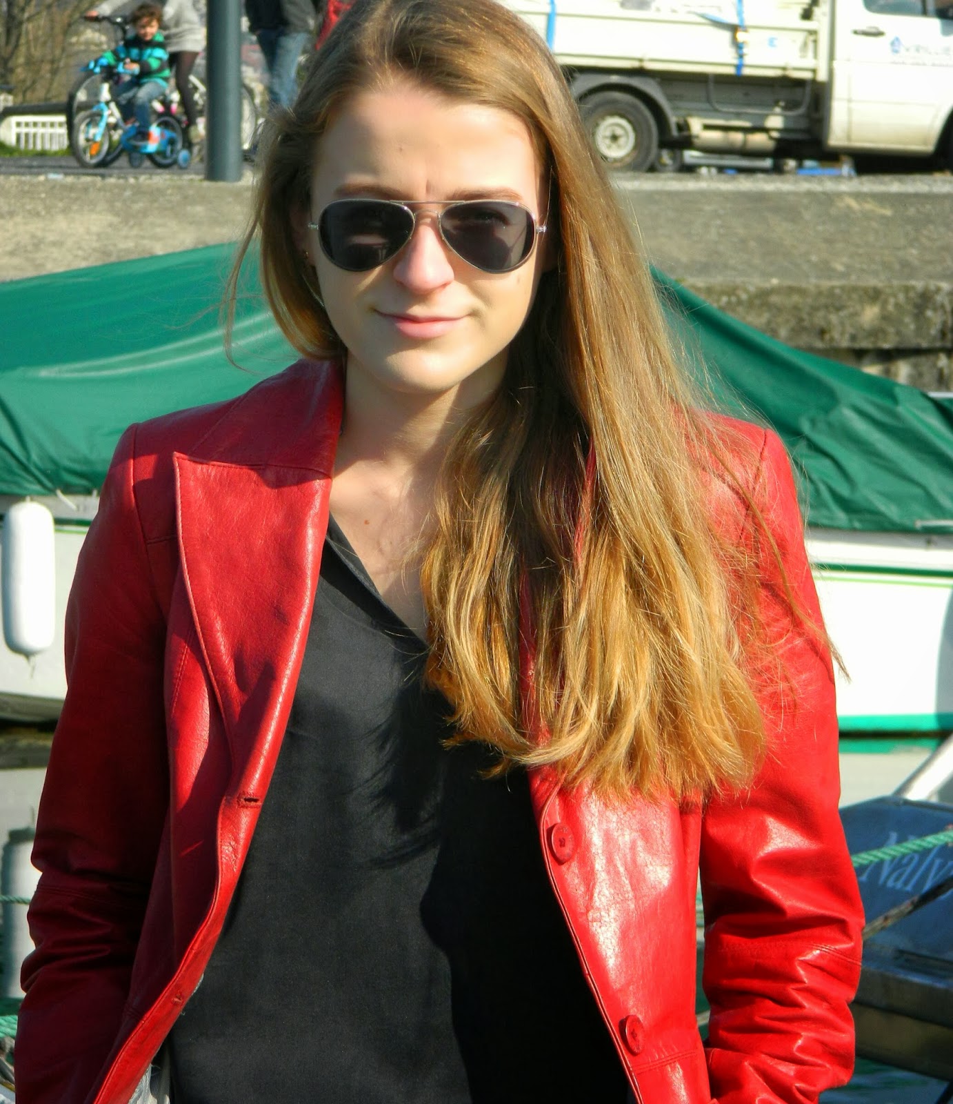 Un look sur le port d’Aix les Bains shooté en cet avant dernier jour de vacances. Une journée bien chaude, j’ai d’ailleurs eu la super idée de mettre ce manteau en cuir (maligne la fille non?), des bottines noires, un jegging noir et une blouse noire. Décidément, j’ai bien choisi mes fringues pour cette journée… Je voulais quand même vous montrer ce manteau en cuir de ma mère, trop petite pour elle. Elle est désormais mienne. Le cuir j’adore que ce soit en perfecto, en short, et maintenant en manteau.
