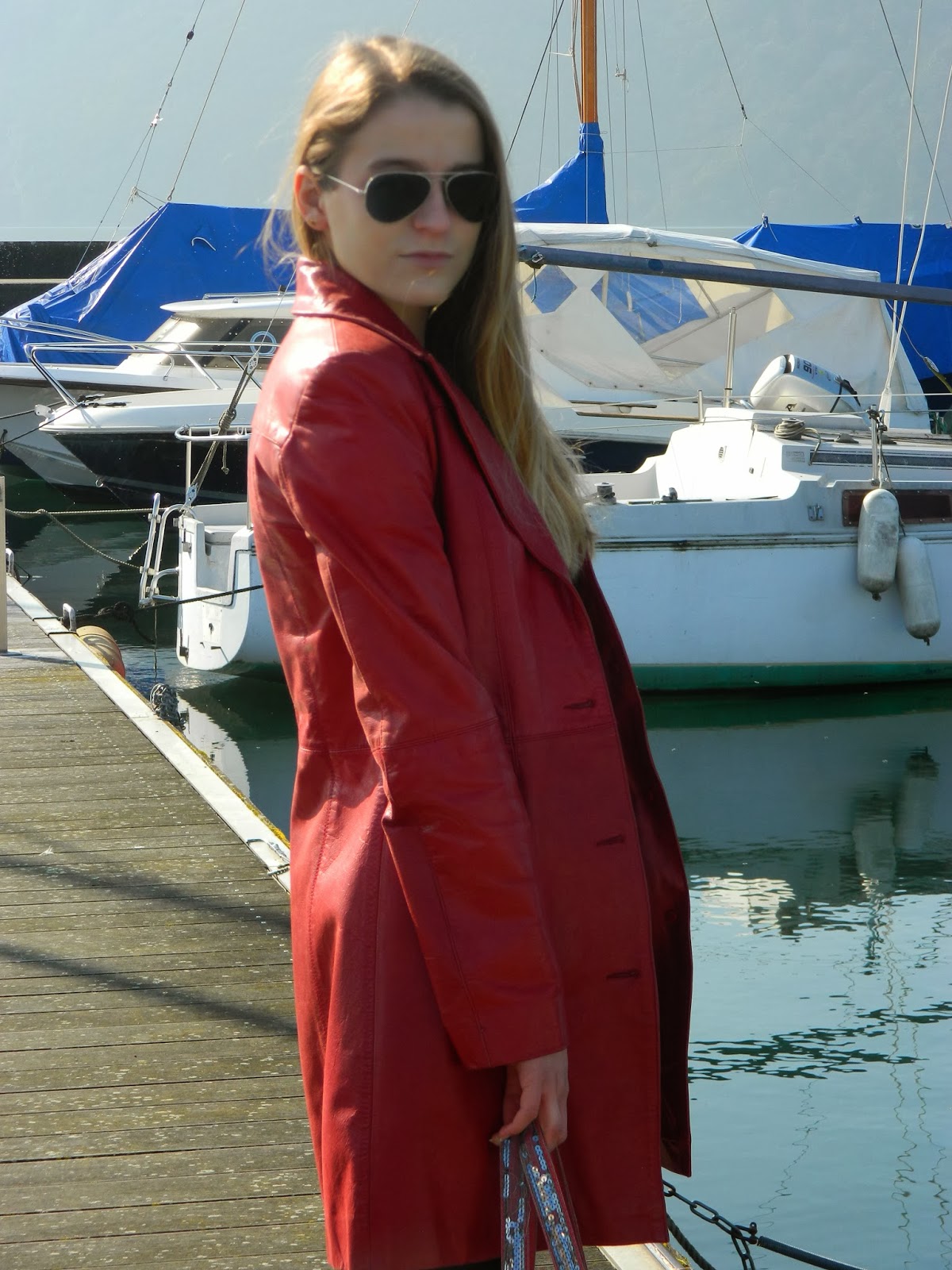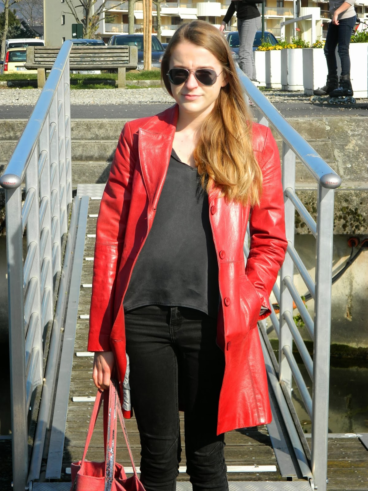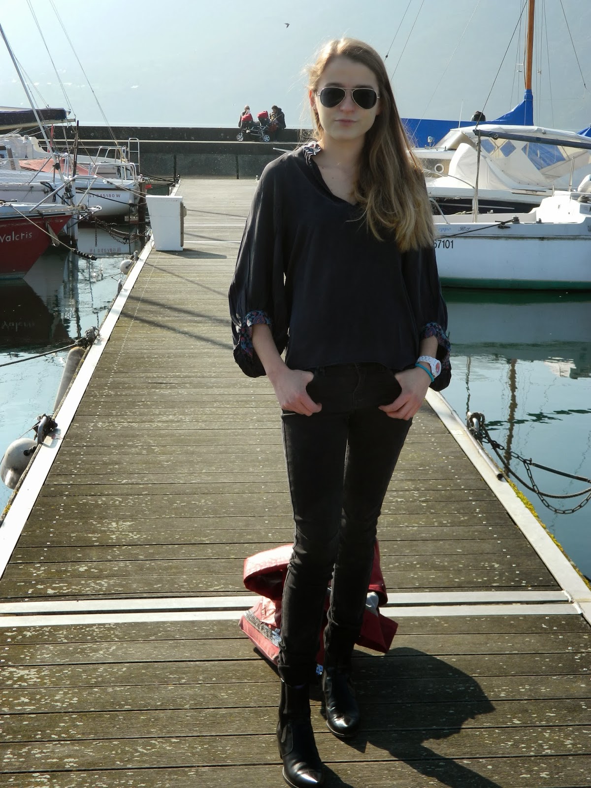 Un look sur le port d’Aix les Bains shooté en cet avant dernier jour de vacances. Une journée bien chaude, j’ai d’ailleurs eu la super idée de mettre ce manteau en cuir (maligne la fille non?), des bottines noires, un jegging noir et une blouse noire. Décidément, j’ai bien choisi mes fringues pour cette journée… Je voulais quand même vous montrer ce manteau en cuir de ma mère, trop petite pour elle. Elle est désormais mienne. Le cuir j’adore que ce soit en perfecto, en short, et maintenant en manteau.