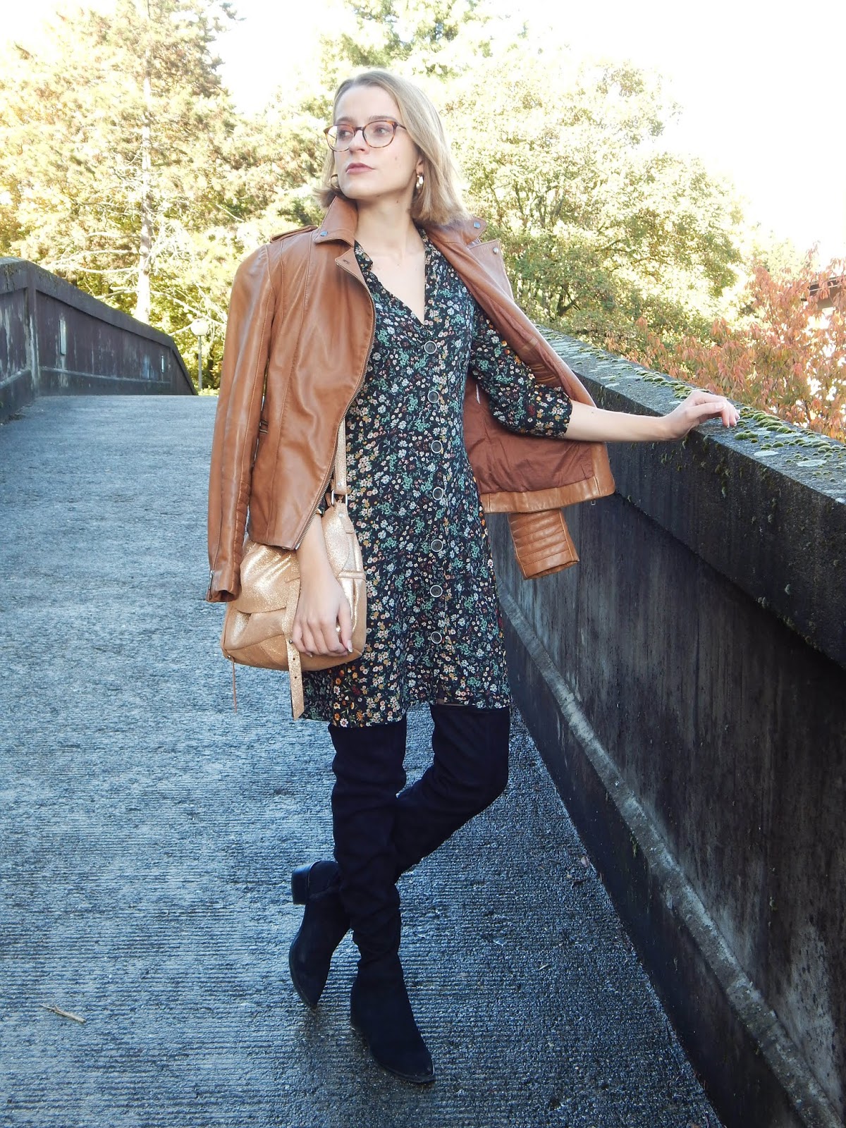 Je me suis quand même motivée ce matin même, où il faisait beau pour shooter deux tenues, dont celle-ci composée de ma nouvelle robe fleurie Stradivarius. Je l’avais déjà portée deux, trois fois, et je l’aime vraiment beaucoup. Faite avec d’assez gros boutons sur tout le long, elle est assez légère et très féminine. Un super achat qui ne m’a coûté que 20€. Avec je porte des cuissardes Stradivarius toujours, achetées l’année dernière. Pour me réchauffer un peu, car nous sommes tout de même en novembre, j’ai opté pour ma veste en cuir marron.
