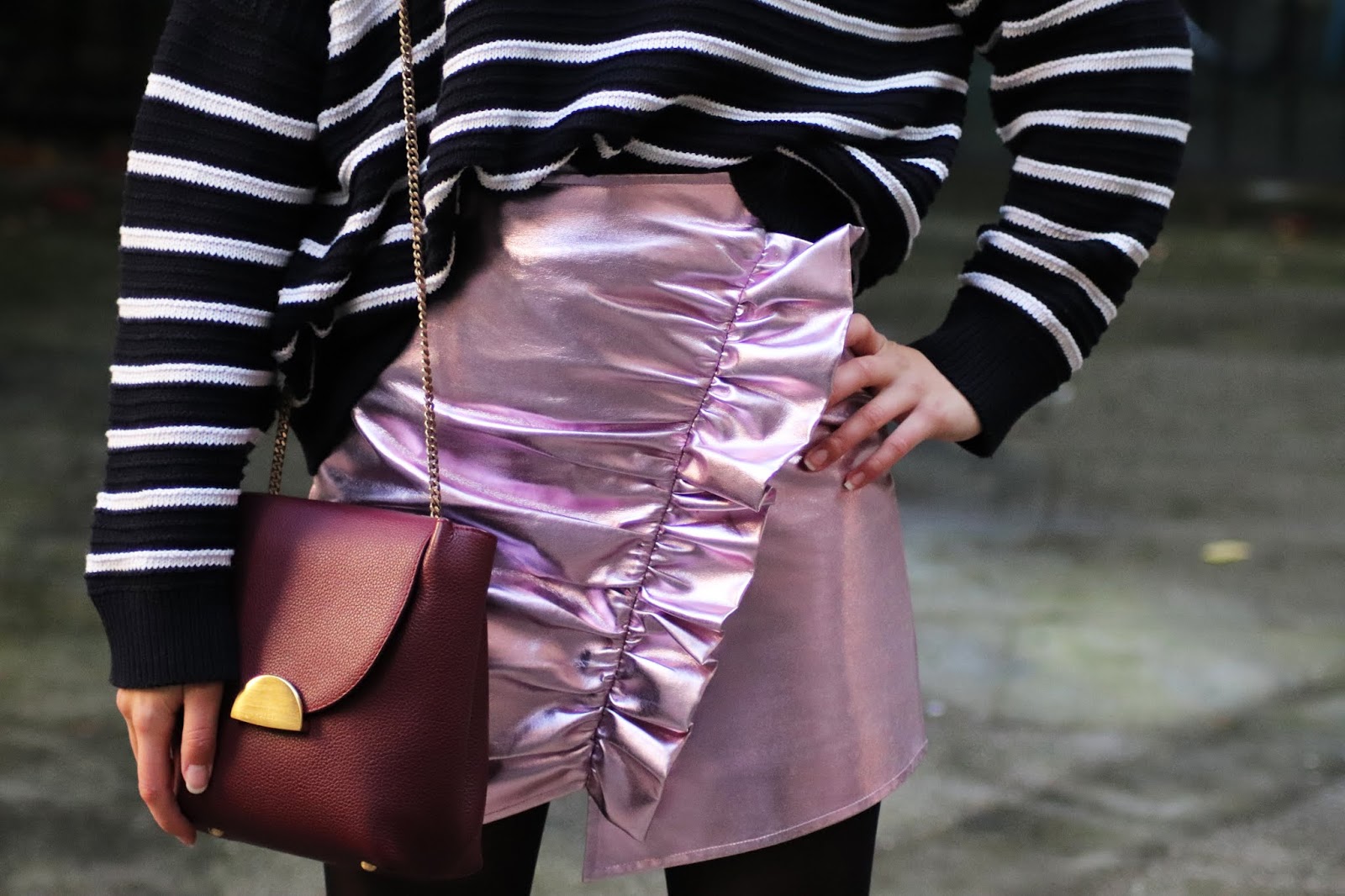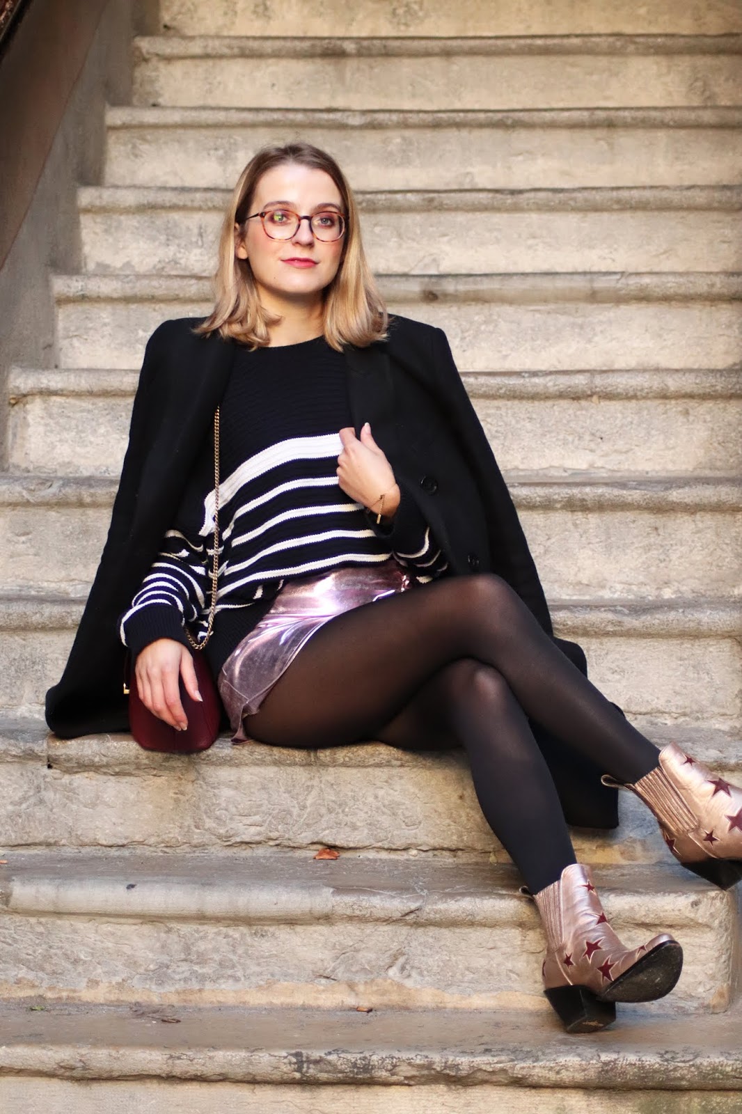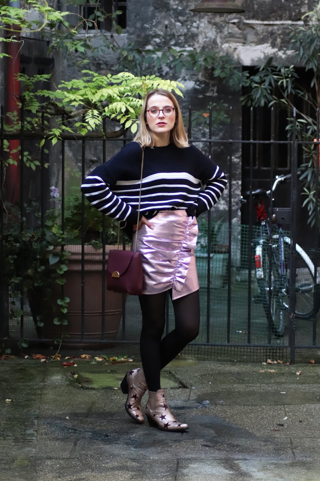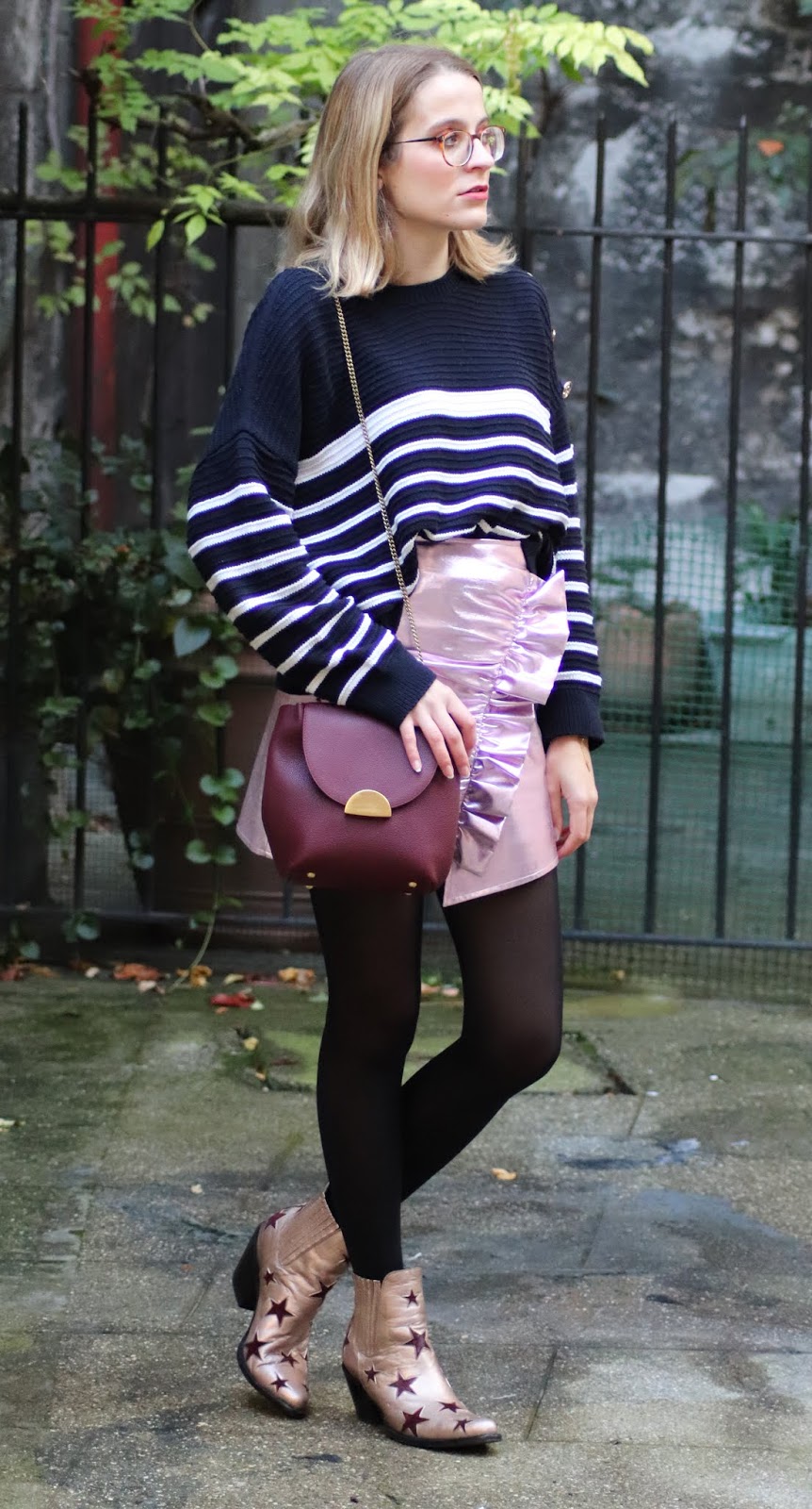 Pull/Sweater: Stradivarius; Jupe/Skirt: Mango; Sac/Purse: Polene; Bottines/Booties: Mexicana