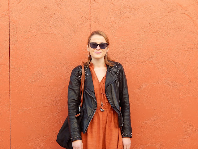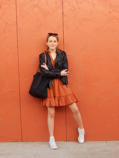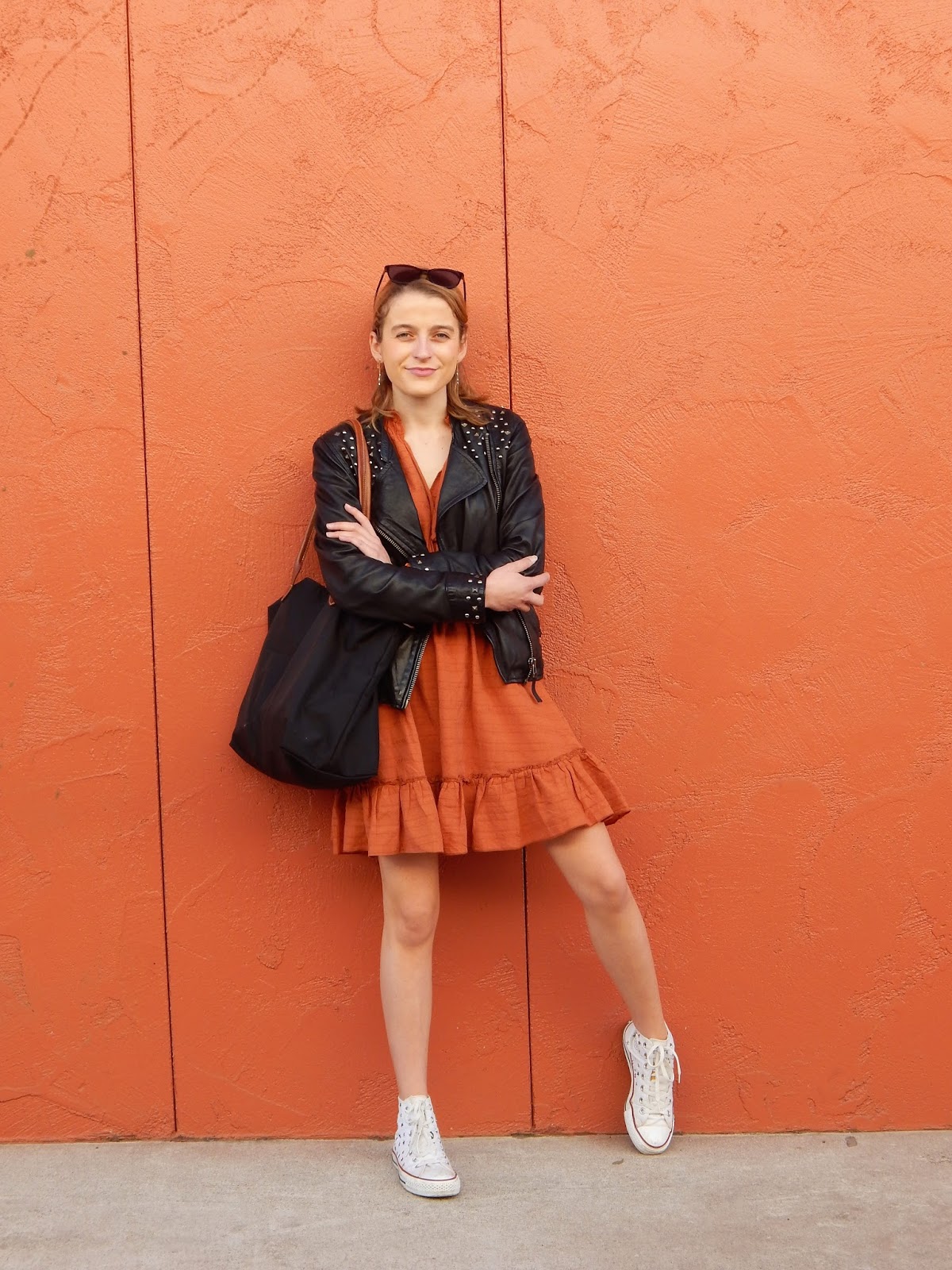 J’ai quand même été sous le charme de deux robes, celle-ci, que j’ai finalement prise, des ventes privées m’ayant convaincue, et une autre étoilée qui était un peu grande. Je suis tombée sous le charme de cette robe, dont j’adore la coupe, assez boho, la couleur rouille, et les détails des lacets sur le devant qui ajoutent un truc en plus au look. Je l’ai prise dans ma valise et j’ai bien fait. Il s’agit de la première série de photos américaine jambes nues, les journées étant en général agréables, entre 13 et 16-17 degrés, mais les matinées et soirées sont fraîches. Donc soit un moment dans la journée on a froid, soit chaud… C’est comme ça LA… Mais cette journée-ci j’ai eu de la chance, je n’ai pas eu tellement froid, à part quand on attendu le bus trente minutes en rentrant de l’école, mais un peu chaud lorsque nous avons mangé le midi à l’extérieur. Comme je vous le disais, vu qu’il fait frais quand on part le matin, j’ai opté pour ma veste en cuir. Et mes Converse parce que ce sont les seules chaussures que j’avais qui allaient avec… Je ne vous dis pas le casse-tête vestimentaire que LA a été… La moitié de ma valise ayant été constituée de jupes et de petits tee-shirts, la moitié du séjour ayant plu et n’ayant pas dépassé les 12-13 degrés…