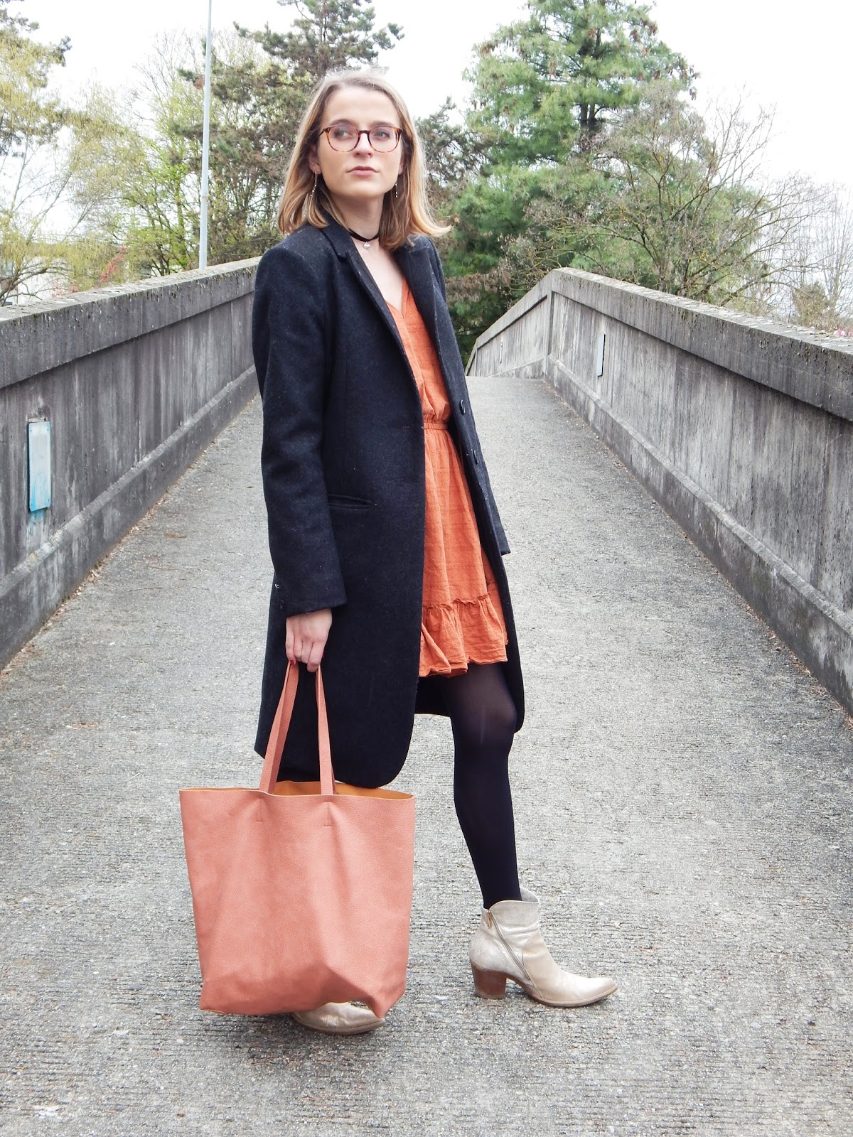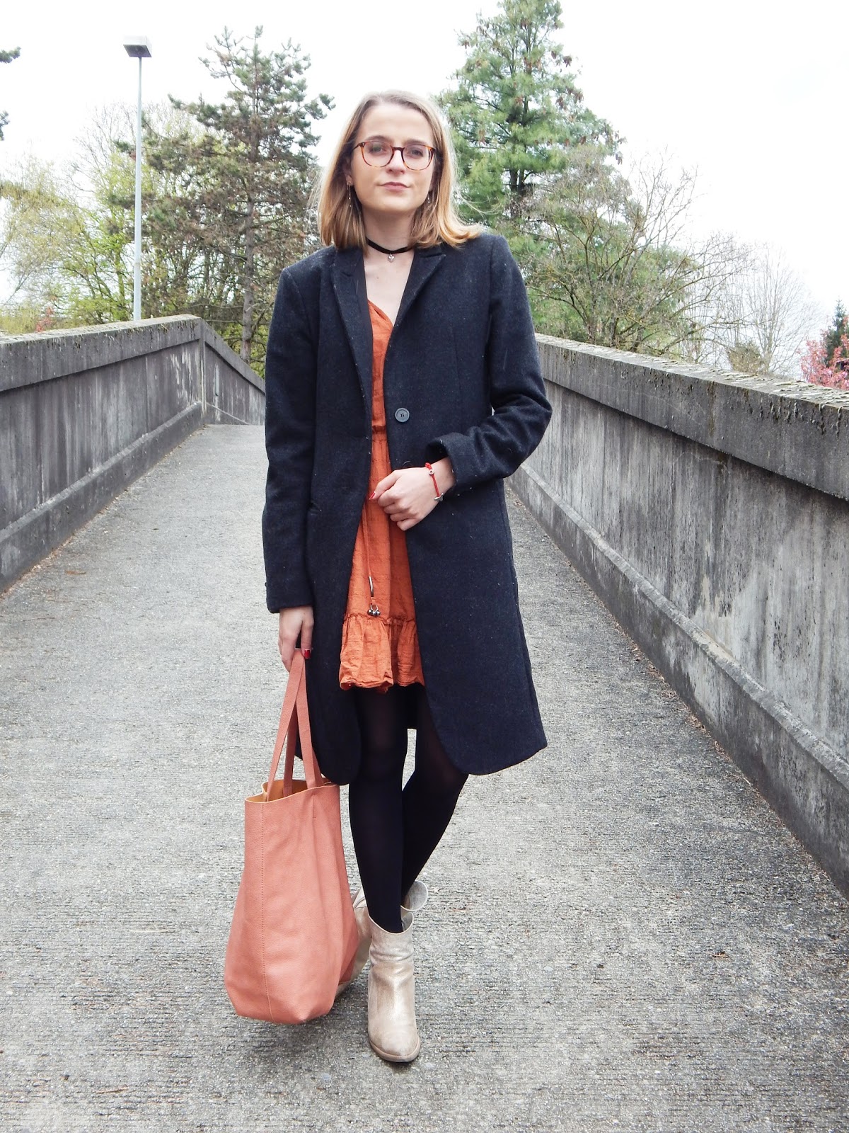 Manteau/Coat: IKKS; Robe/Dress: JCL chez Village market; Choker: New Look; Sac/Bag: La Halle; Bottines/Booties: Paprika