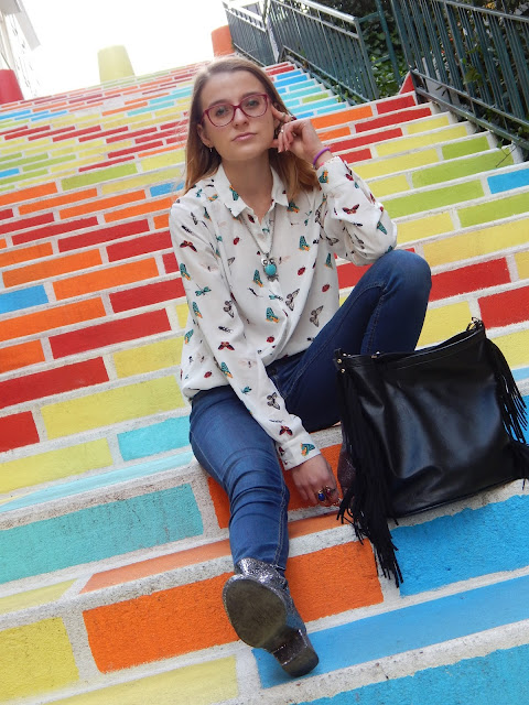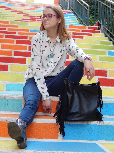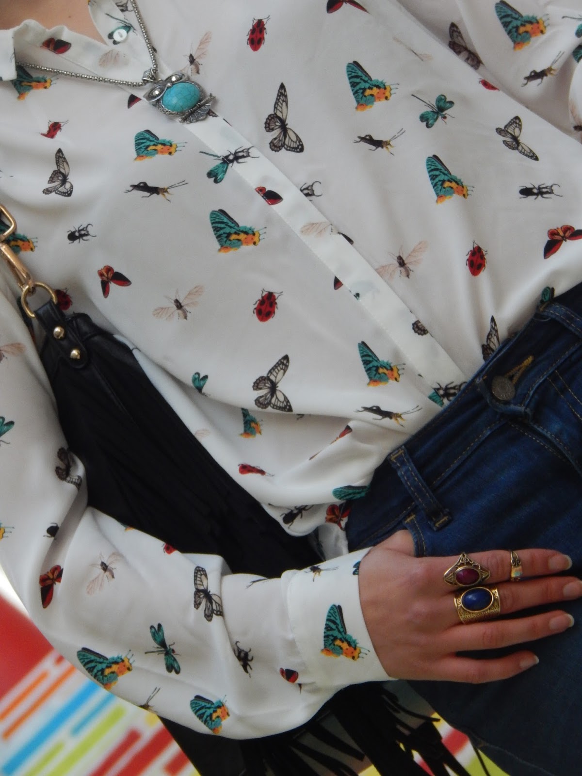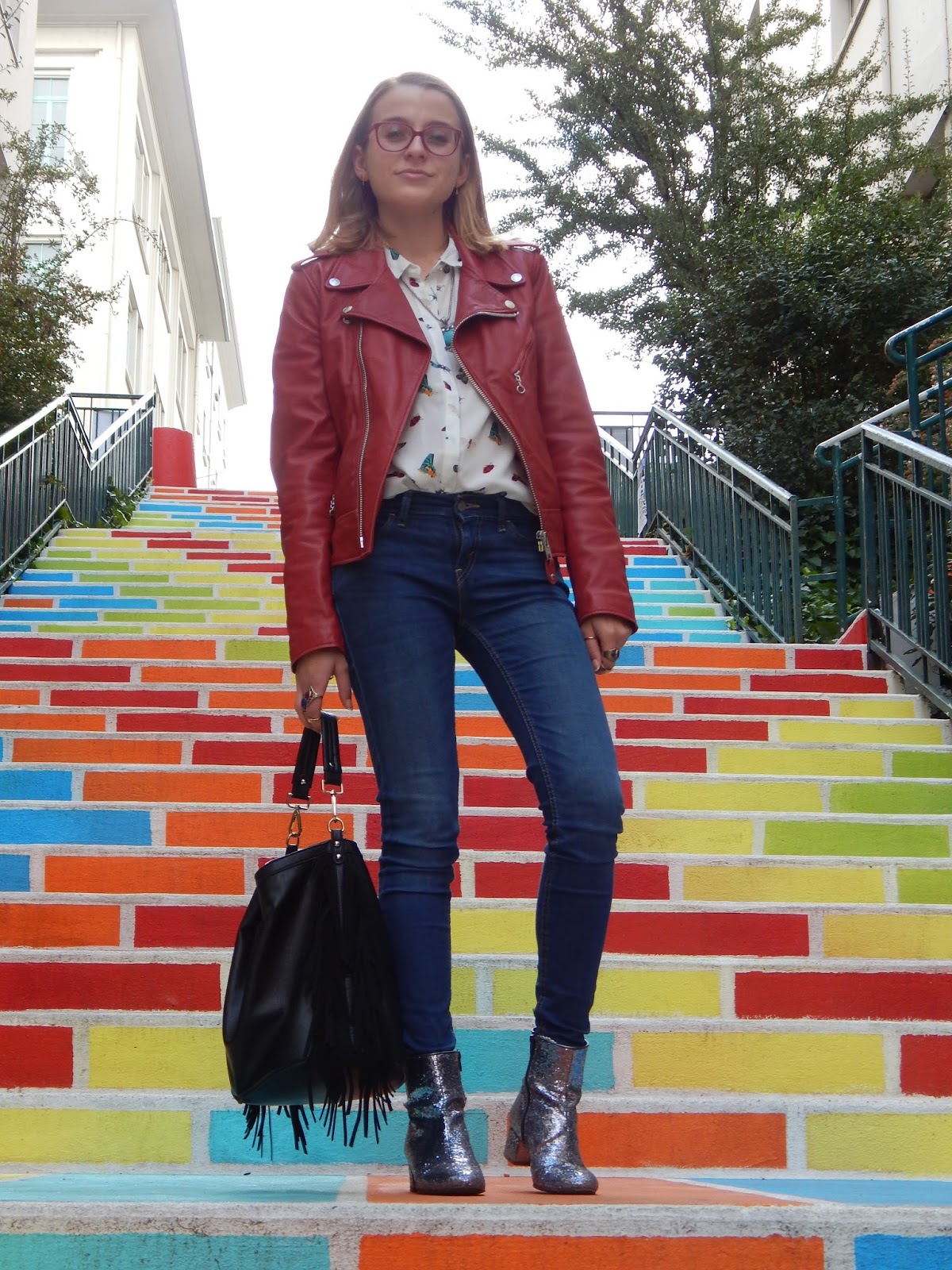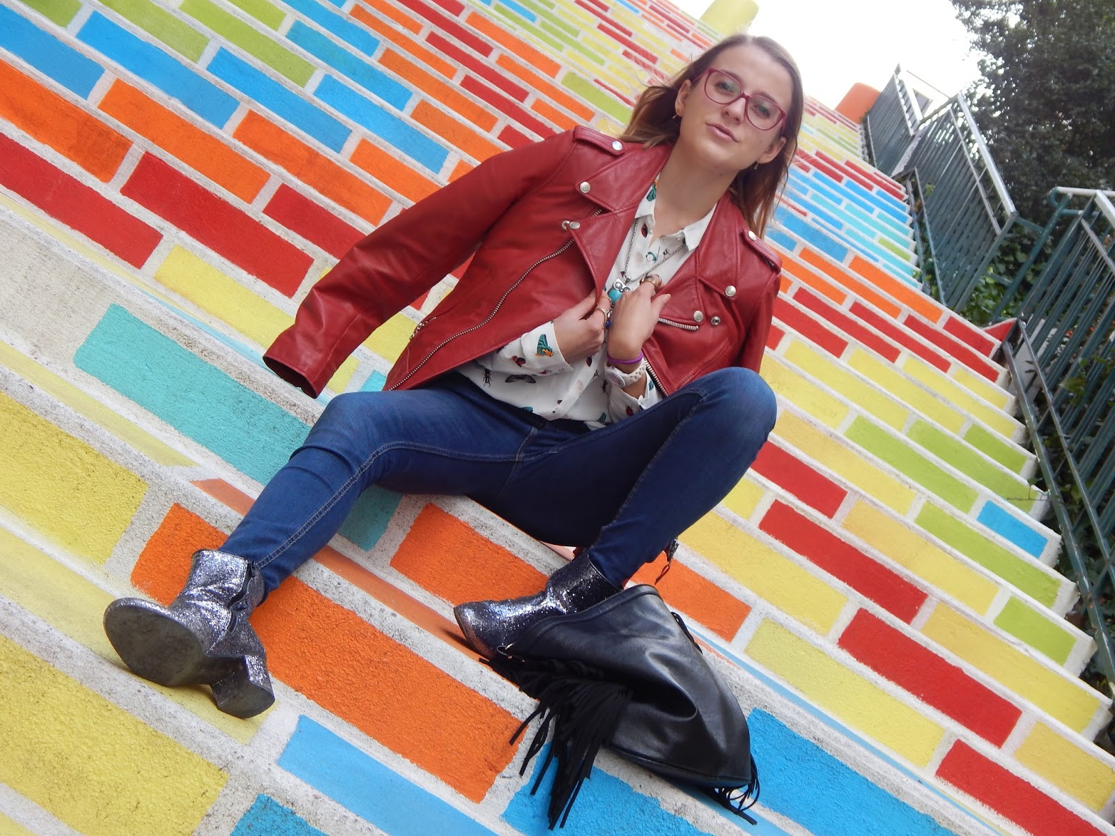 Ce jour-là, j’avais amené ma cousine à un shopping photo où j’avais fait mes photos, au Studio Toni R. Une sorte d’échange de bon compromis, je lui ai payé sa séance, et elle m’a immortalisé plusieurs de mes looks. Ce jour-là je portais ma veste en cuir rouge, ayant apporté à Lyon seulement deux vestes, pas très facile donc de varier complètement à ce niveau-là, ma nouvelle chemise Pimkie imprimée animaux que j’avais achetée quelques jours auparavant, après avoir succombé au -10% que la boutique proposait ce jour-là. Mon Levis et mes bottines glitter que je mets décidément tout le temps, sont super confortables et vont avec quasiment tout. J’espère que le look vous plaira. Pour les accessoires, mes nouvelles bagues Primark que j’avais achetées la veille de ces photos avec une robe que vous verrez bientôt. Primark d’ailleurs, c’était beaucoup de monde pour des vêtements d’aspect de qualité médiocre, et pas tellement de choses qui me plaisaient. Bref.