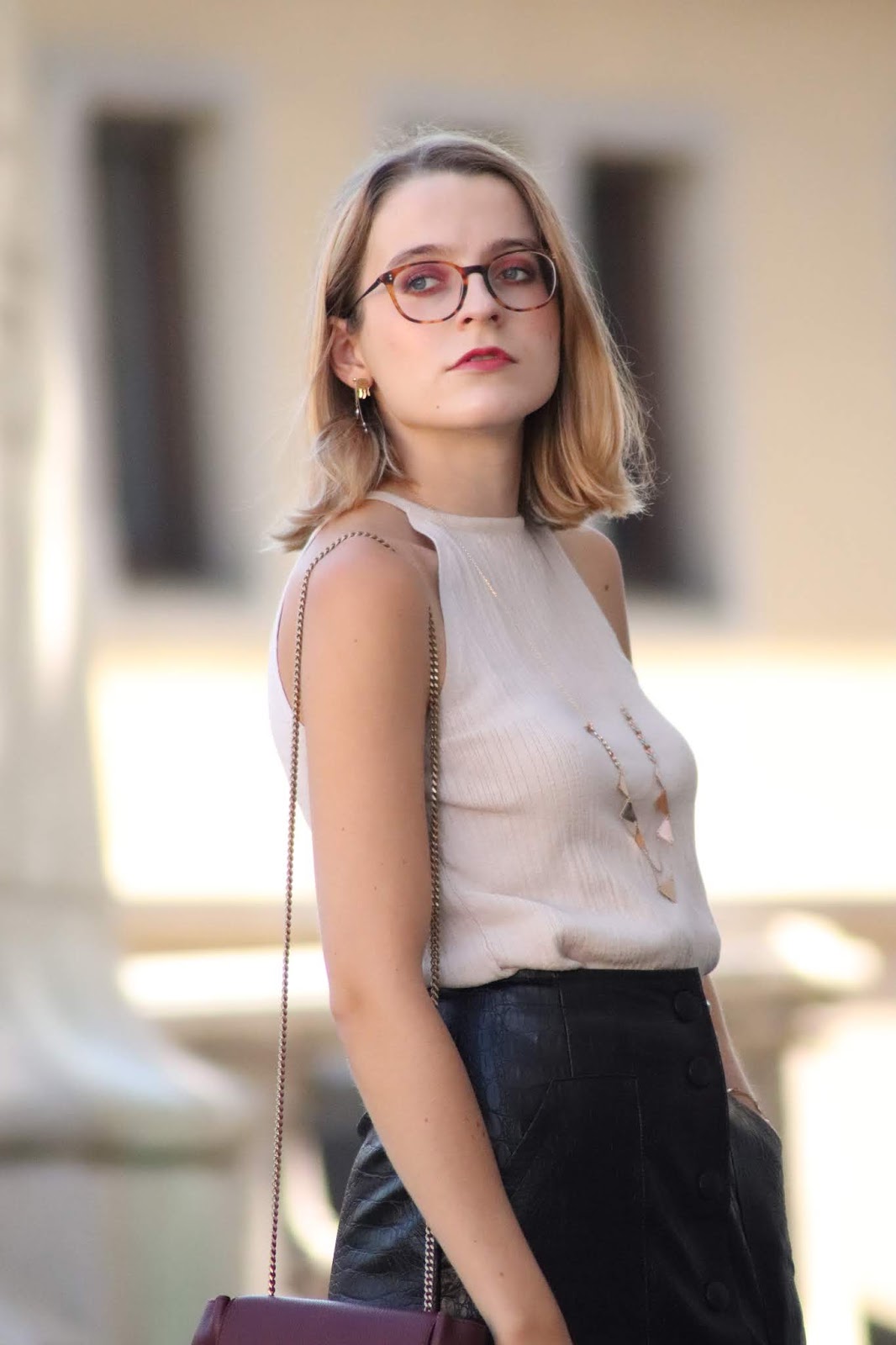En ce moment il fait encore super bon, voire chaud, j’en ai donc profité pour reporter ce petit haut acheté à Milan, que je ne vous avais pas montré. Je l’ai associé à ma jupe en similicuir aspect croco Stradivarius achetée ce début d’année. Habituellement je la porte l’hiver, car elle est assez chaude, trop chaude pour l’été, mais avec 20 degrés, 25 max, ça passe. Aux pieds, je porte une paire de sandales style Valentino Rockstud que je rêve de posséder, achetées pour une trentaine d’euros sur Asos cet été qui m’auront bien suivie et dont je suis beaucoup trop fan. Et qui bizarrement sont assez confortables!