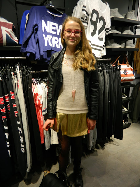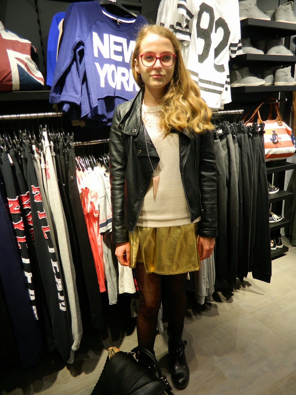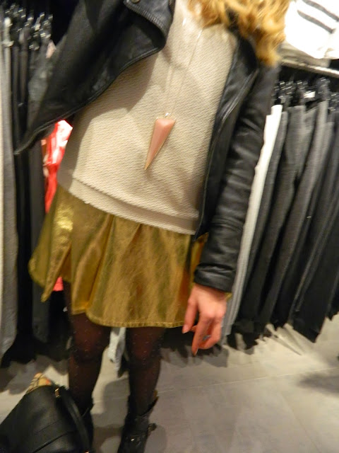 Mon look composé de mon perf Mango; mon haut Jennyfer, mon collier I am; ma jupe métallisée Tally Weijl; mes collants plumetis H&M et mes boots Méliné