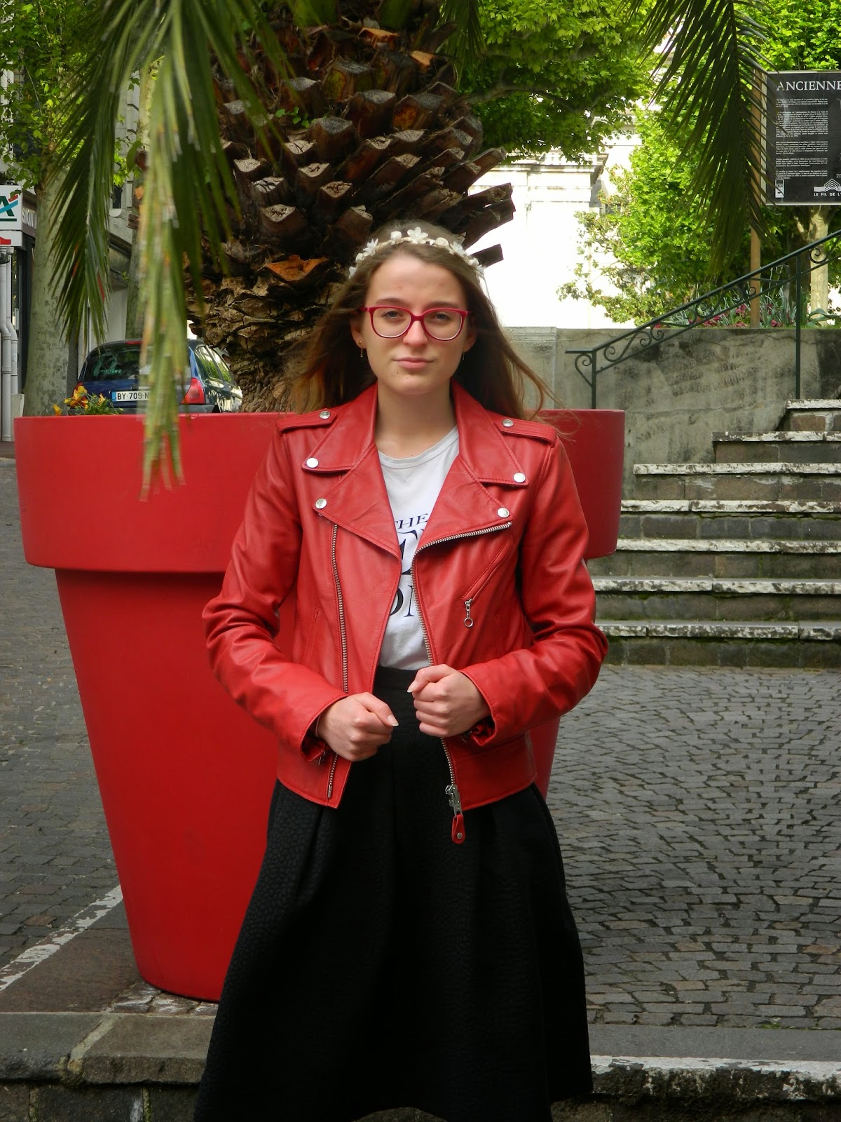 Veste/Jacket: Schott NYC; Haut/Shirt and Jupe/Skirt: H&M; Headband: Bijoux Brigitte; Sandales/Sandals: Elite; Vernis/Nail polish: OPI