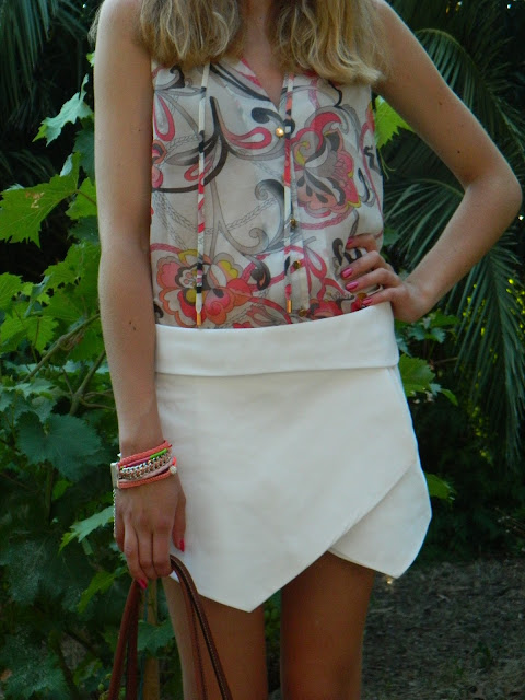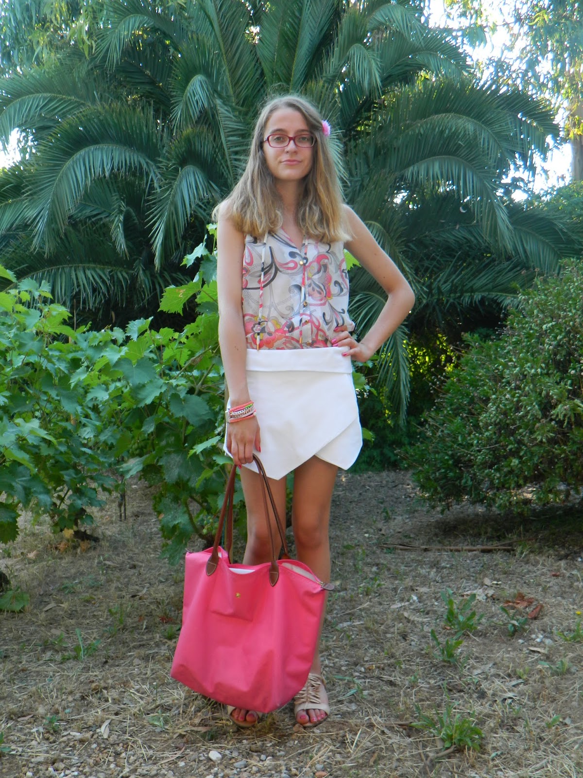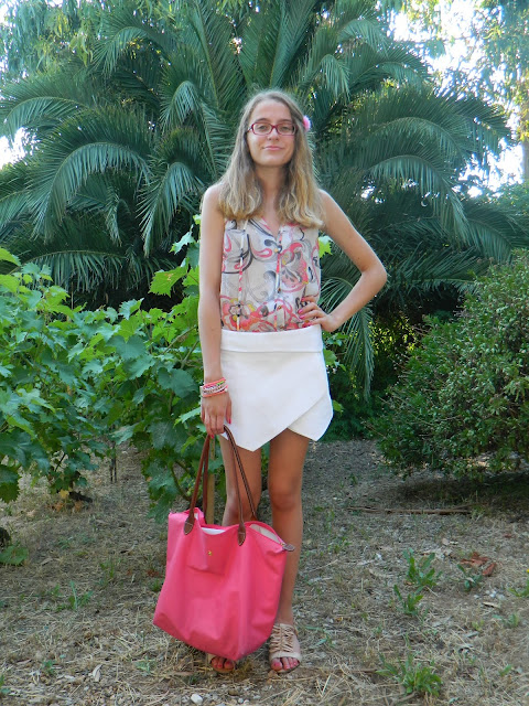 Top et fleur H&M; Skort: Zara; Bracelet: marché; Sac: Longchamp; Sandales: San Marina;