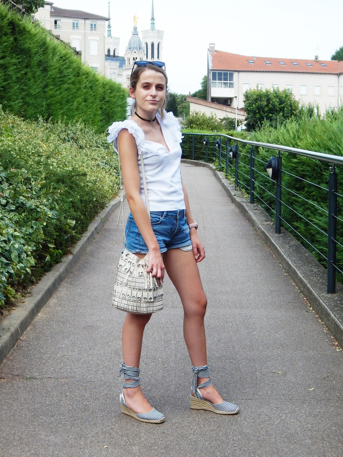J’aime aussi beaucoup, on peut vraiment voir que ce haut se marie avec tout type de bas. Je porte encore et toujours mon sac seau de chez Mango, tellement pratique, je le porte sans arrêt, mais c’est un de mes seuls suffisamment grand pour mettre mon appareil photo, et en même temps pas trop énorme non plus. Nouveauté également dans ce look, il s’agit de cette paire d’espadrilles compensées achetées le matin même de ces photos. Nous sommes allés faire un tour à la Part Dieu pour les soldes, et je suis tombée sur cette superbe paire d’espadrilles. Soldées à 20€, confortables, aspects très important, puisque je vous ai déjà dit que j’avais beaucoup de mal à supporter les talons, et que c’était très pénible. J’avais essayé une paire de chez Pimkie, en même pas dix secondes j’avais mal aux pieds. Je me suis un peu résignée jusqu’à voir celles-ci. J’aimais aussi beaucoup la couleur, la hauteur pas trop élevée, et les jolies lanières qui entourent joliment la cheville. Je trouve que ça fait une super silhouette, je suis trop fan!