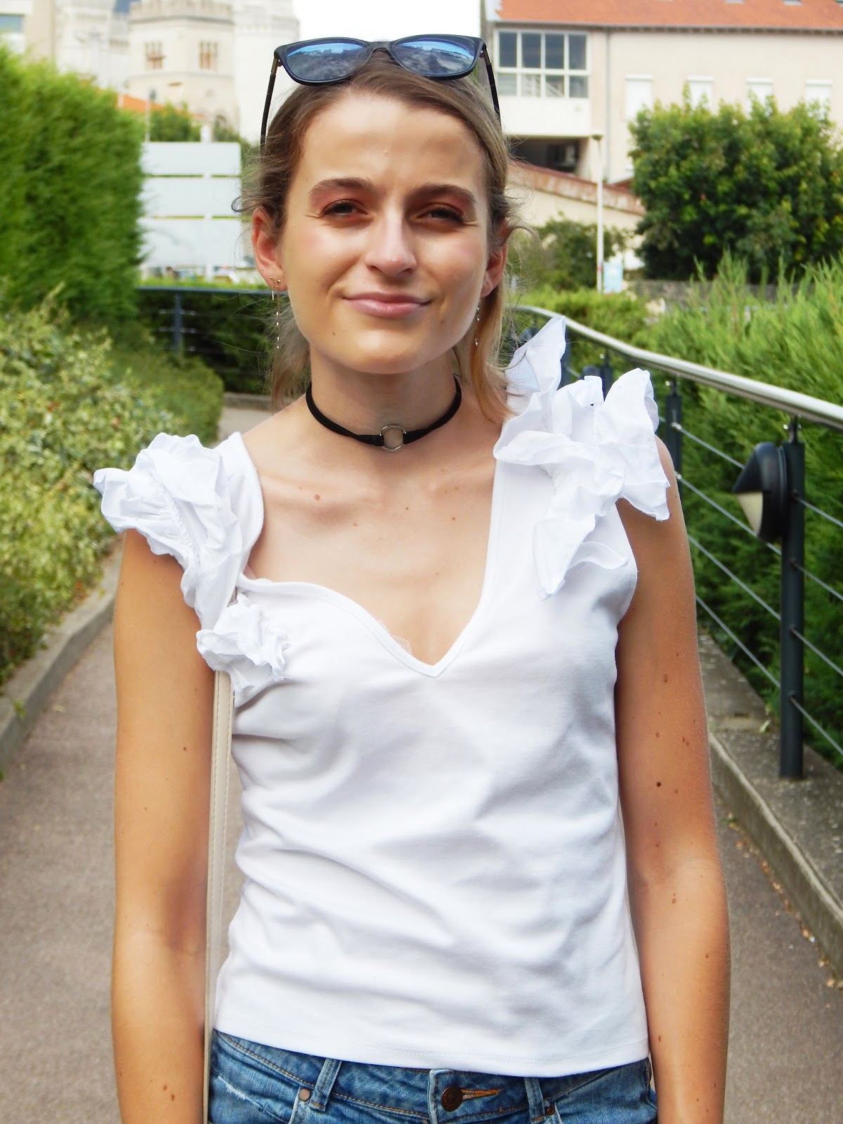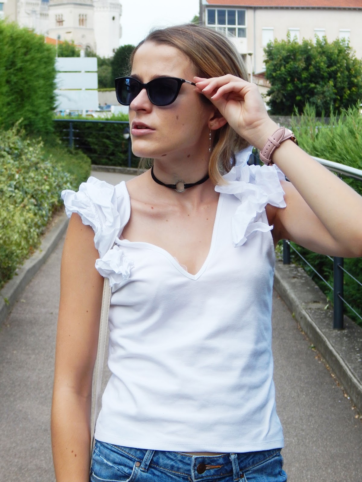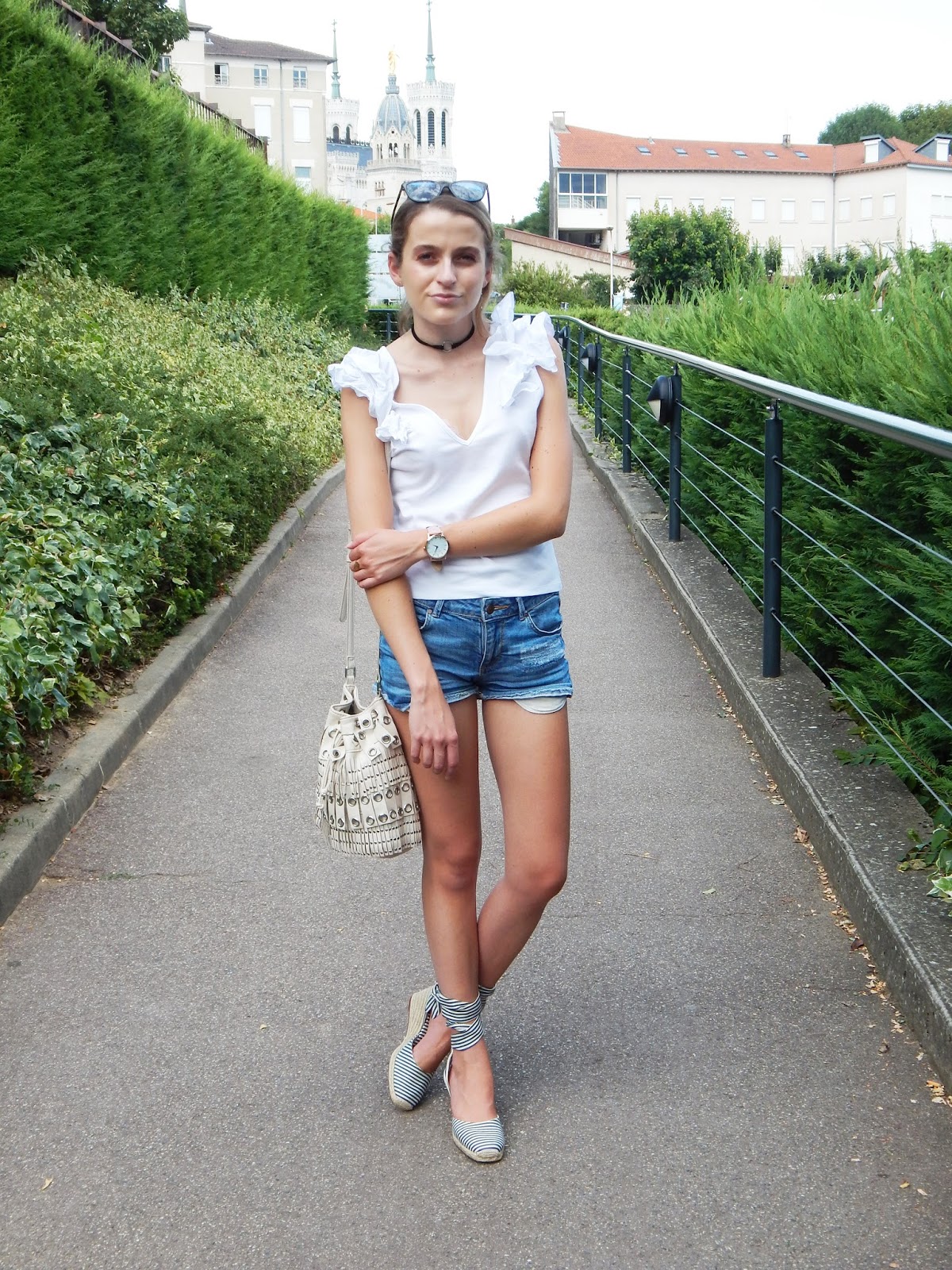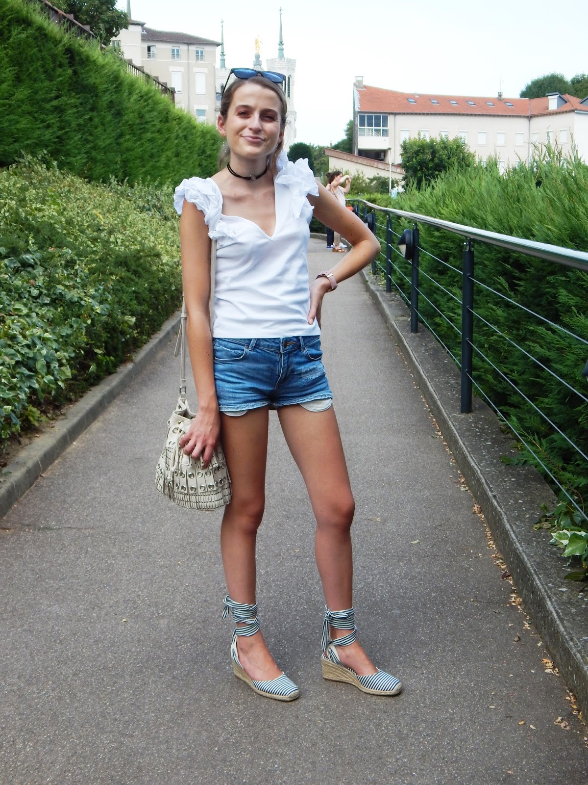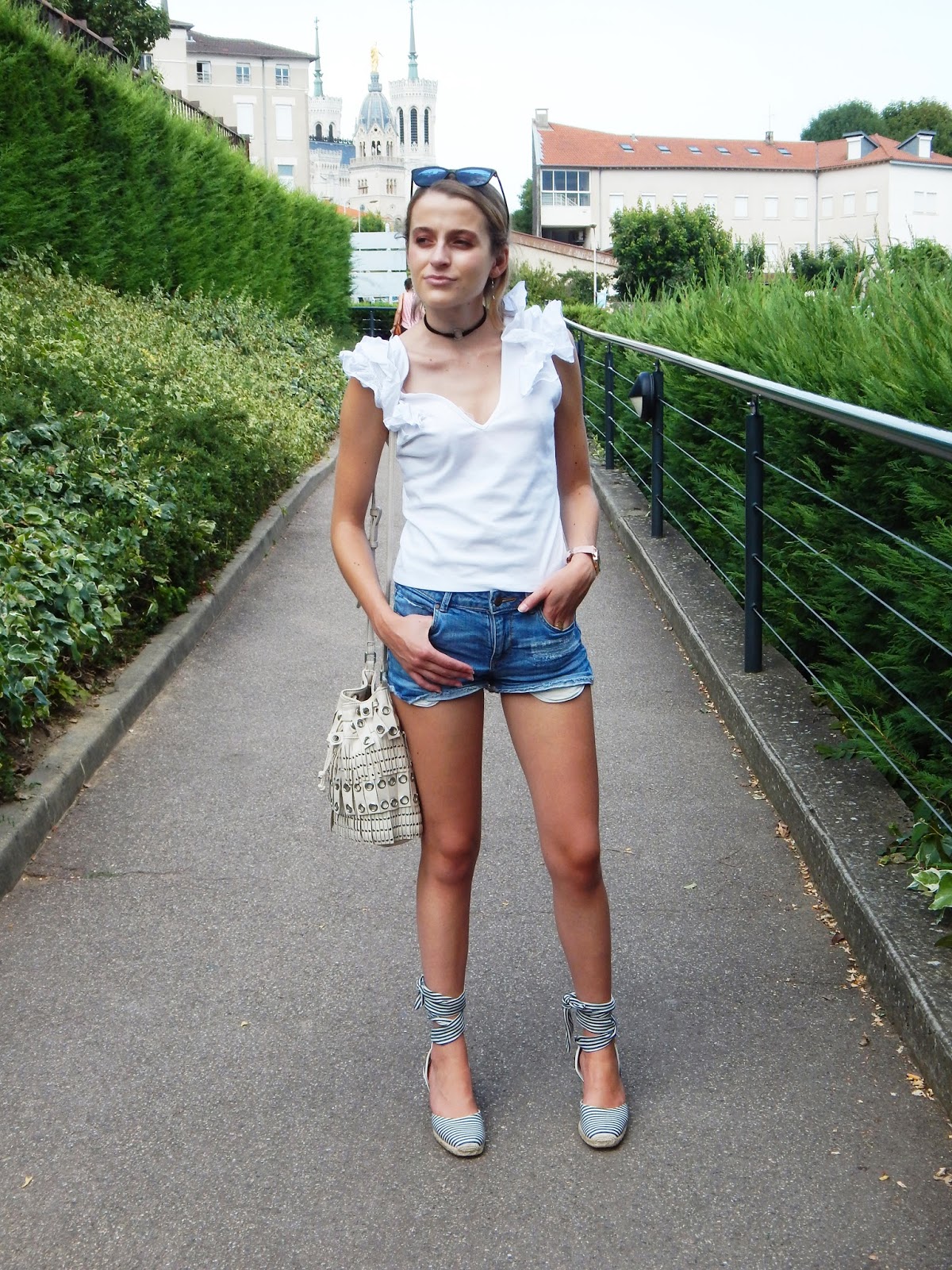 Lors de notre dernier week-end à Lyon, où la chaleur était très forte, nous avons voulu faire un tour au musée gallo-romain, afin de nous rafraîchir un peu. Puis nous sommes allés vers l’amphithéâtre afin de profiter du joli cadre pour prendre des photos avec Fourvière en arrière-plan. Je porte mon haut Zara à froufrous, que vous avez vu ici en noir, et sur lequel j’ai craqué en blanc également. Honnêtement, je voulais prendre aussi le rouge… Cette forme est tellement jolie, trop classe. Cette fois-ci, je l’ai associé à un short en jean pour un effet plus décontracté, différent de la tenue chic que je portais ici .