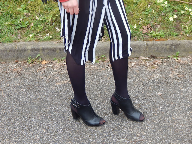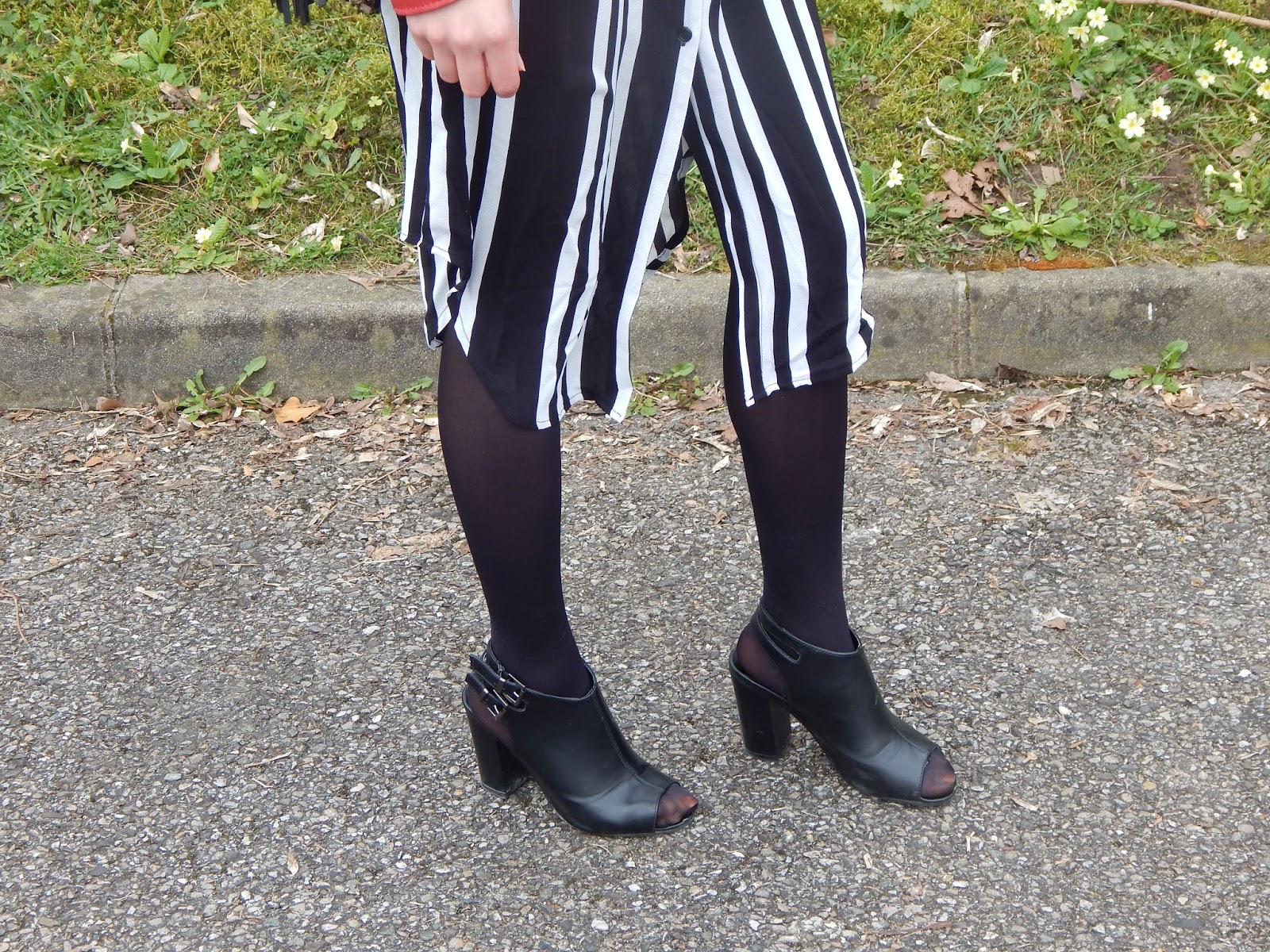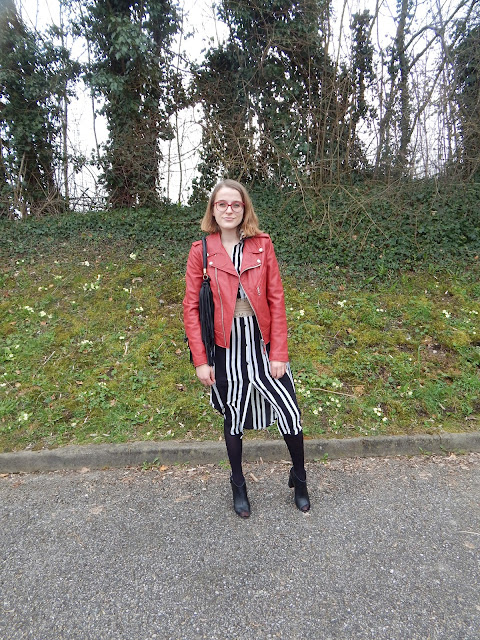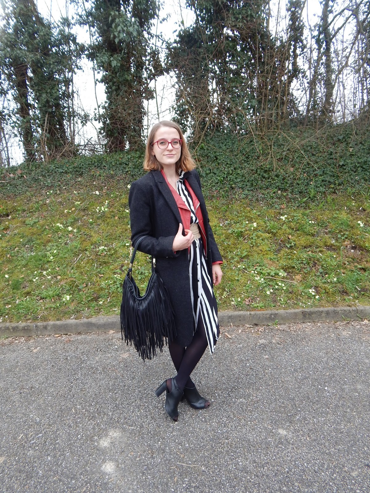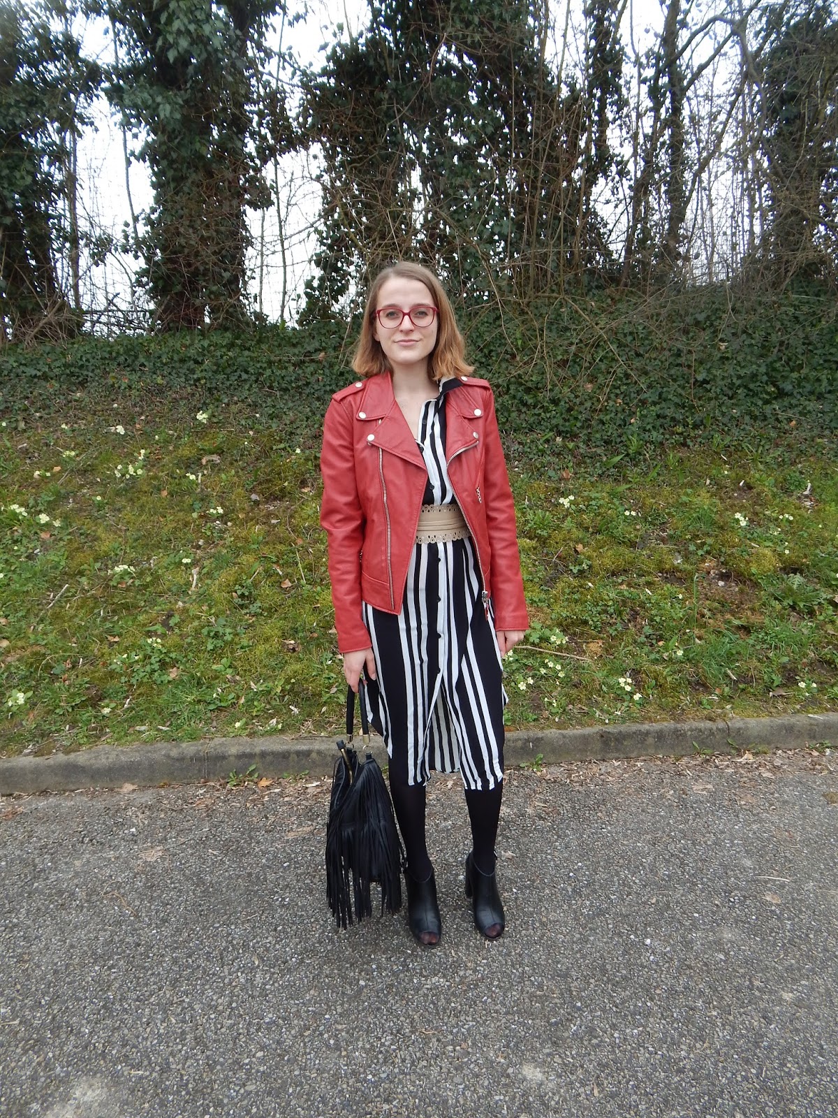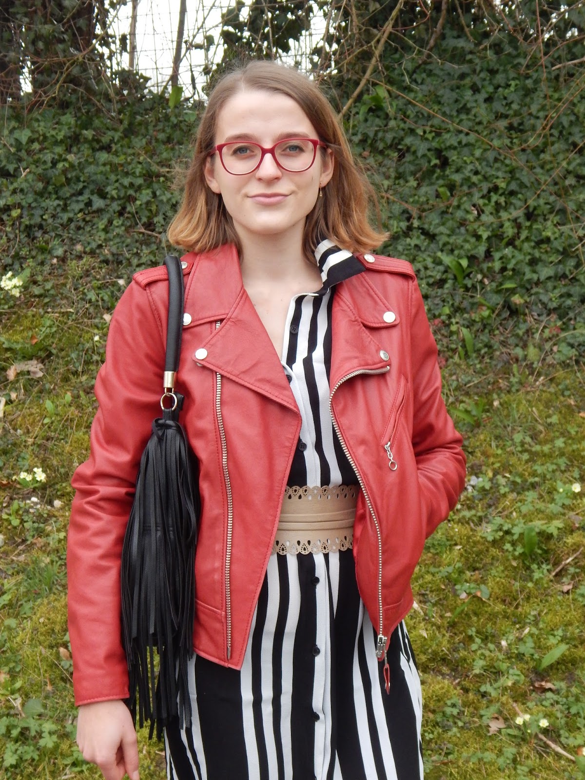 Ce jour-là, je portais ma nouvelle robe chemise de chez Boohoo, que j’ai commandée avec mon crédit de 100€, je vous la montrais là. J’ai fait un haul Boohoo qui sera en ligne jeudi prochain, mais quand je l’ai reçue, je n’étais pas super convaincue, et puis en l’essayant, j’ai réussi à adopter cette pièce. De façon ceinturée et avec des talons, ça rend plutôt pas mal. Mon perfecto rouge, pour une touche de couleur, mon sac frangé et mes bottines ajourées Jennyfer plus tard, voilà le look final. Vous aimez?