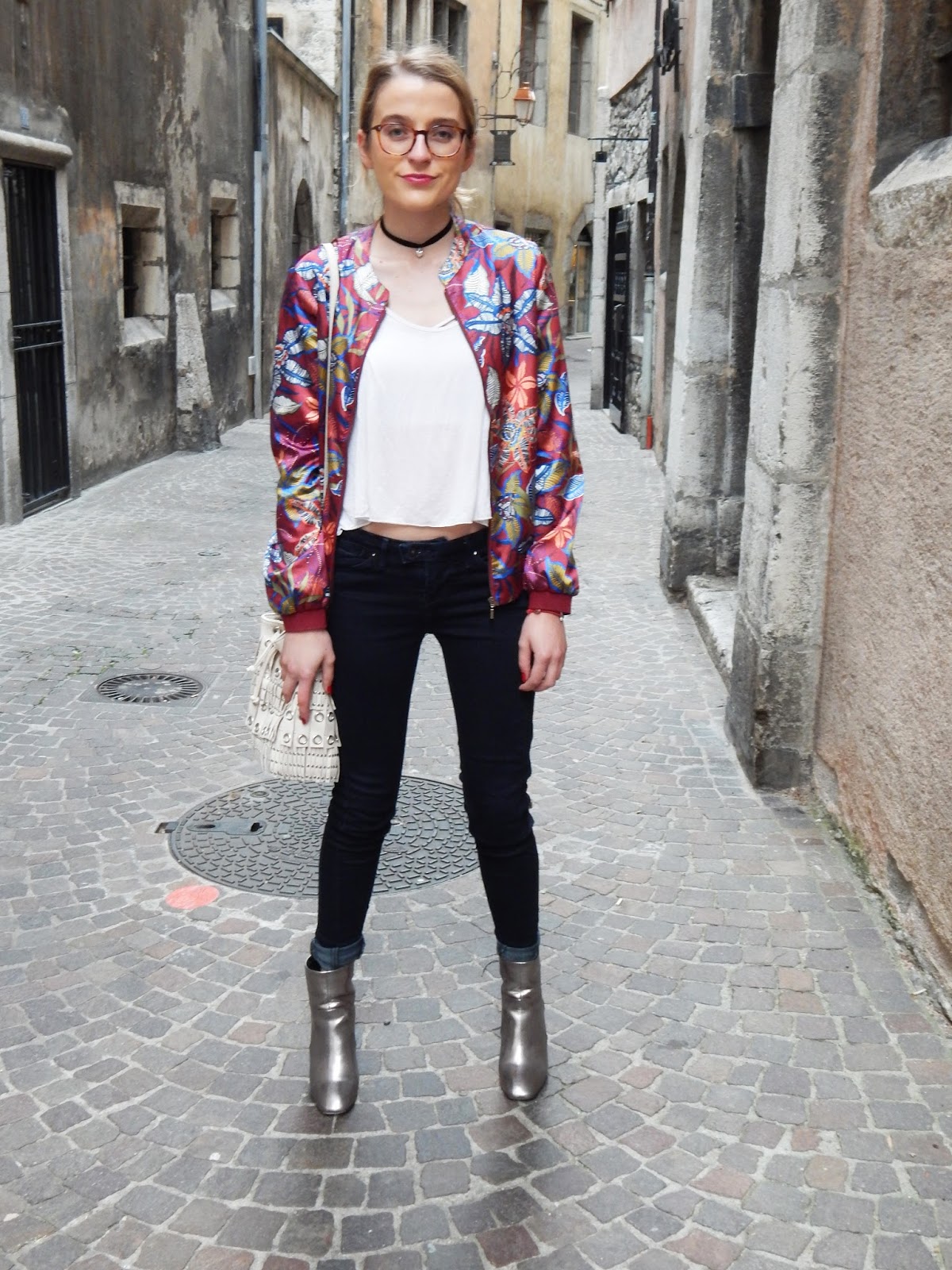 Elle l’avait acheté chez Promod, marque dans laquelle je n’ai pas beaucoup de vêtements, mais, elle réussit parfois à trouver des pièces sympas. Un haut blanc en dessous, parce que le teddy se suffit à lui-même, avec ma brassière croisée de chez Brandy Melville en dessous, comme dans cette tenue, également shootée dans cette rue, décidément ahah.