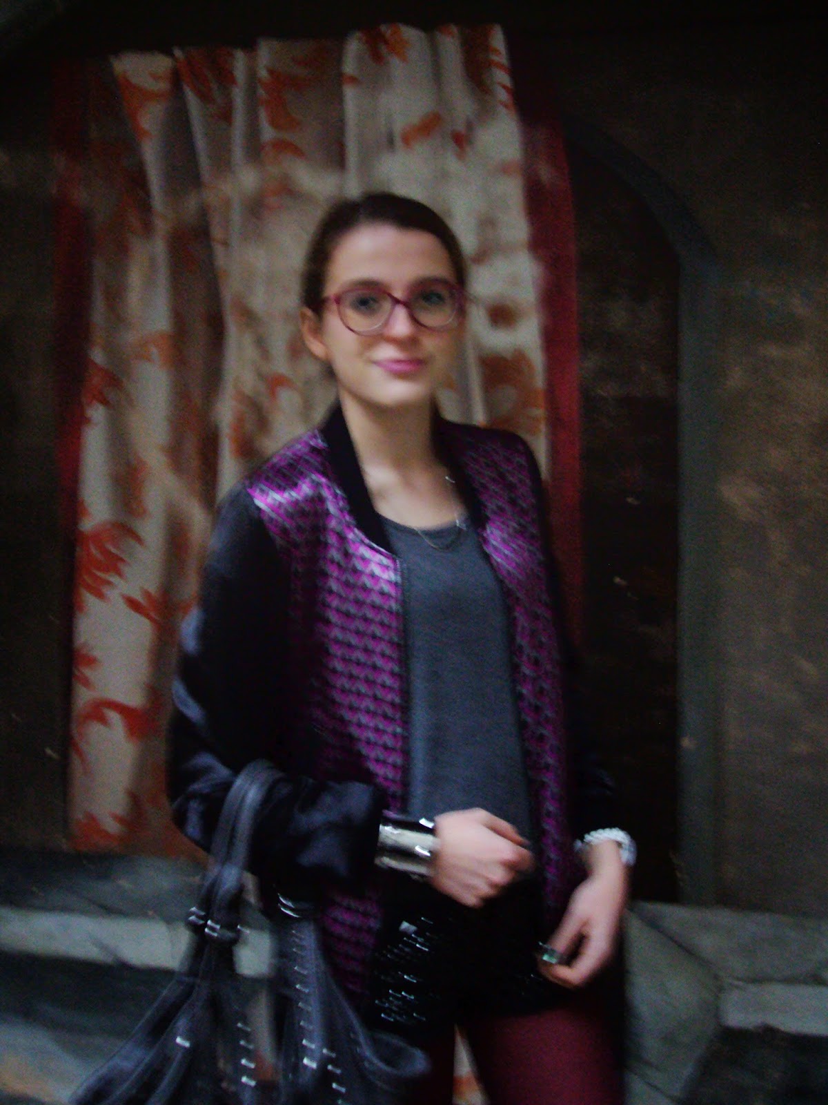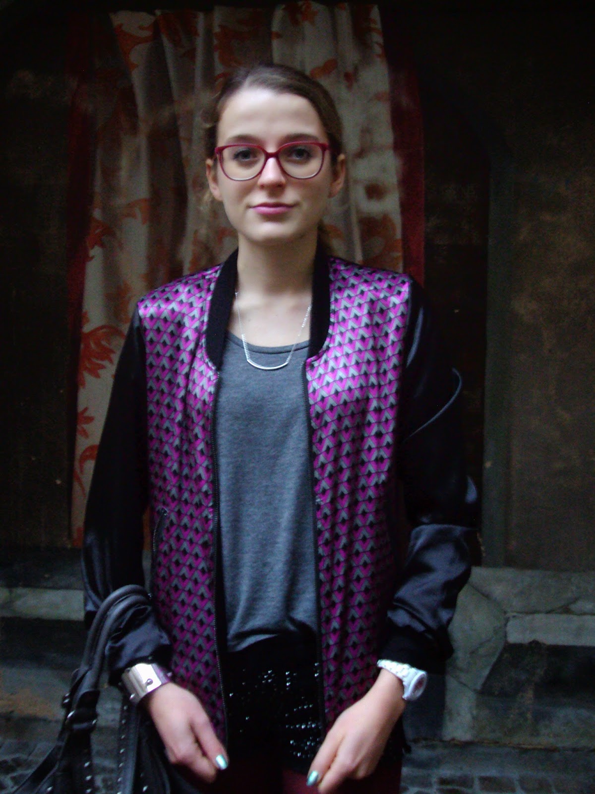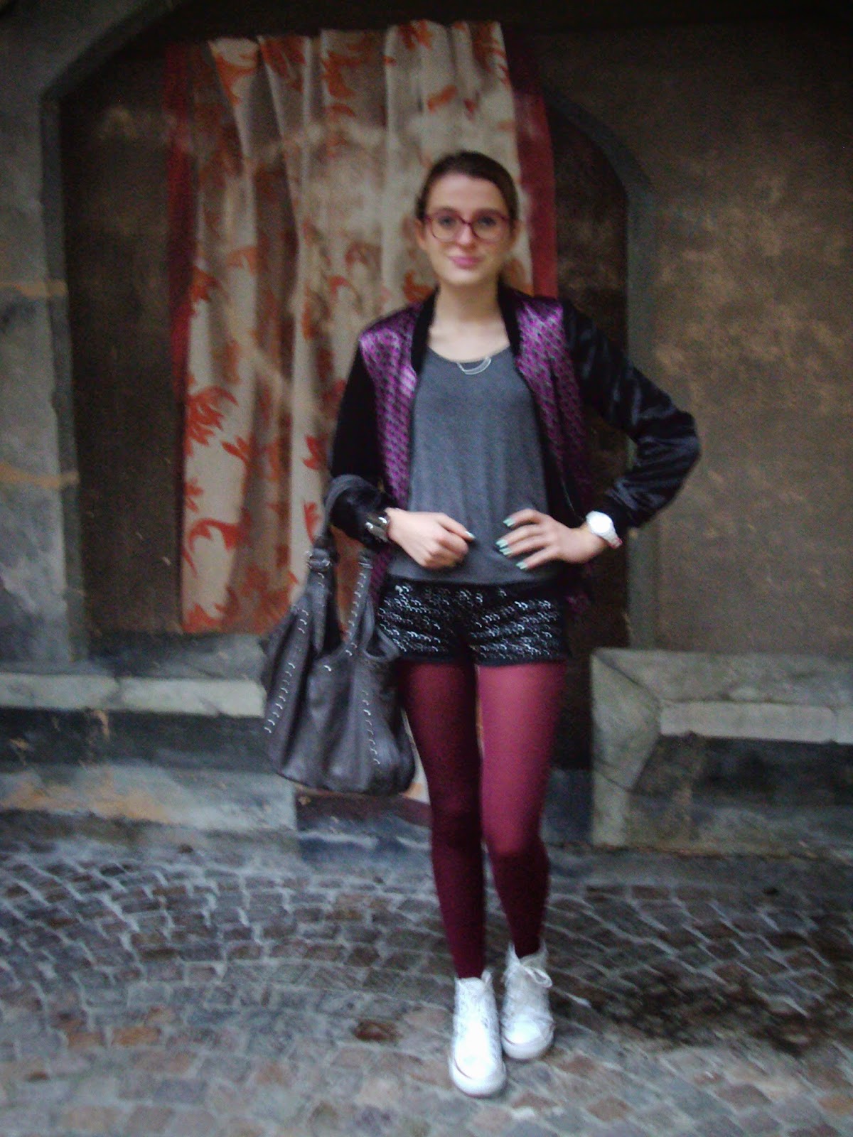 Un look aux tendances violettes shooté le dernier dimanche de novembre. Un dimanche tranquille composé de révisions ( traduction anglaise), cinéma, petit tour du marché de noel, goûter tranquille. Bref journée sympa. J’avais envie de violet. Déjà pour sortir mon teddy en satin acheté l’hiver dernier chez New Yorker pour 5 ou 8€ il me semble. Et je crois bien que je ne vous l’avais jamais montré. Pourtant je l’aime bien mais j’avais un peu du mal à l’associer. Mais depuis que j’ai acheté quelques hauts plus basiques qu’à mon habitude ( noirs, gris, blancs), c’est plus facile. Un haut gris tout simple mais tellement doux et confortable et franchement assez chaud( merci Brandy!!) Un short noir, mais tout de même à strass et des touches de violet, dont mon maquillage ( fard à paupières Biguine Make up et un baume coloré Revlon). Avec de l’imprimé violet et un collant de la même couleur, mieux vaut jouer le reste soft. Mon sac gris, mes Converse et mon autre nouveau collier Brandy Melville ( oui cette enseigne va devenir ma marque préférée. Je deviens plus sobre avec l’âge. Dans le même genre qu’Urban Outfitters d’ailleurs. On reparle d’ailleurs bientôt de mes achats américains dans j’espère une vidéo haul.