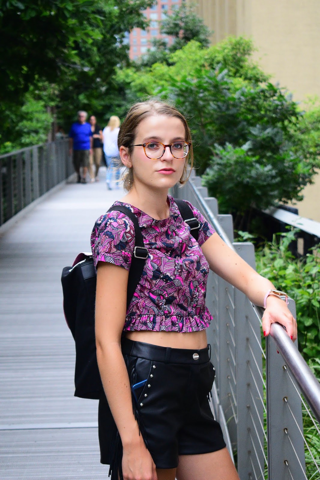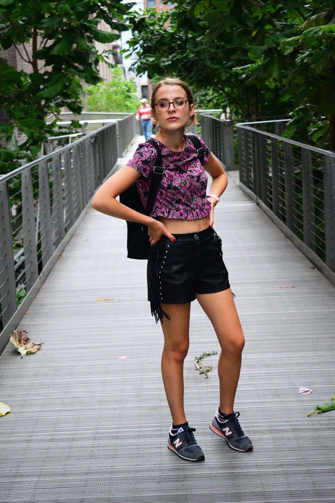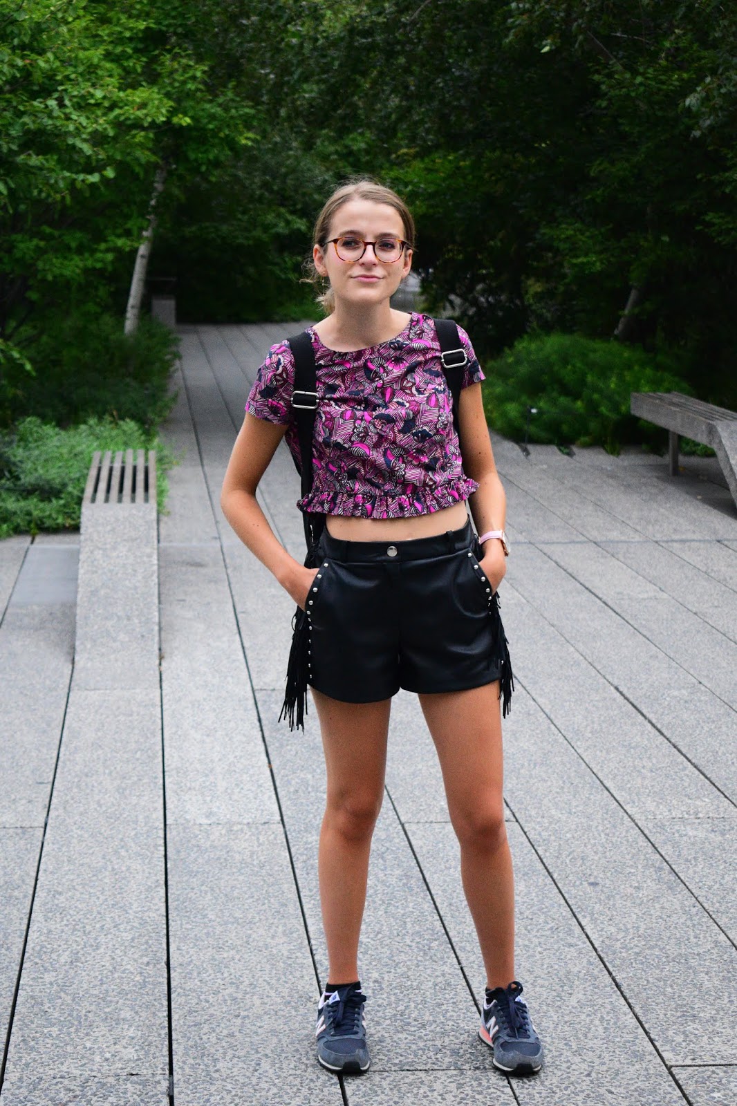 Nous avons pris cette série de photos sur la Highline, endroit vraiment super sympa situé à l’ouest de Manhattan. Il s’agit en fait d’une promenade de 2.4km de long, sur les anciens rails désaffectés d’une voie de chemin de fer. Cette promenade se situe sur les toits entre Chelsea et le Meatpacking District. C’est très vert, très bien entretenu, il y a peu de monde le matin, c’est très agréable ce mélange de verdure et de buildings autour de vous, puisque vous marchez entre les buildings ce qui est assez incroyable. Du coup comme tous les autres jours quasiment, je portais ma paire de baskets afin de pouvoir cavaler de partout à l’aise. Avec, j’ai souhaité quelque chose d’assez féminin. Avant de partir j’avais associé ce short à franges ainsi que ce haut wax de chez Zara et j’aimais plutôt pas mal l’association.