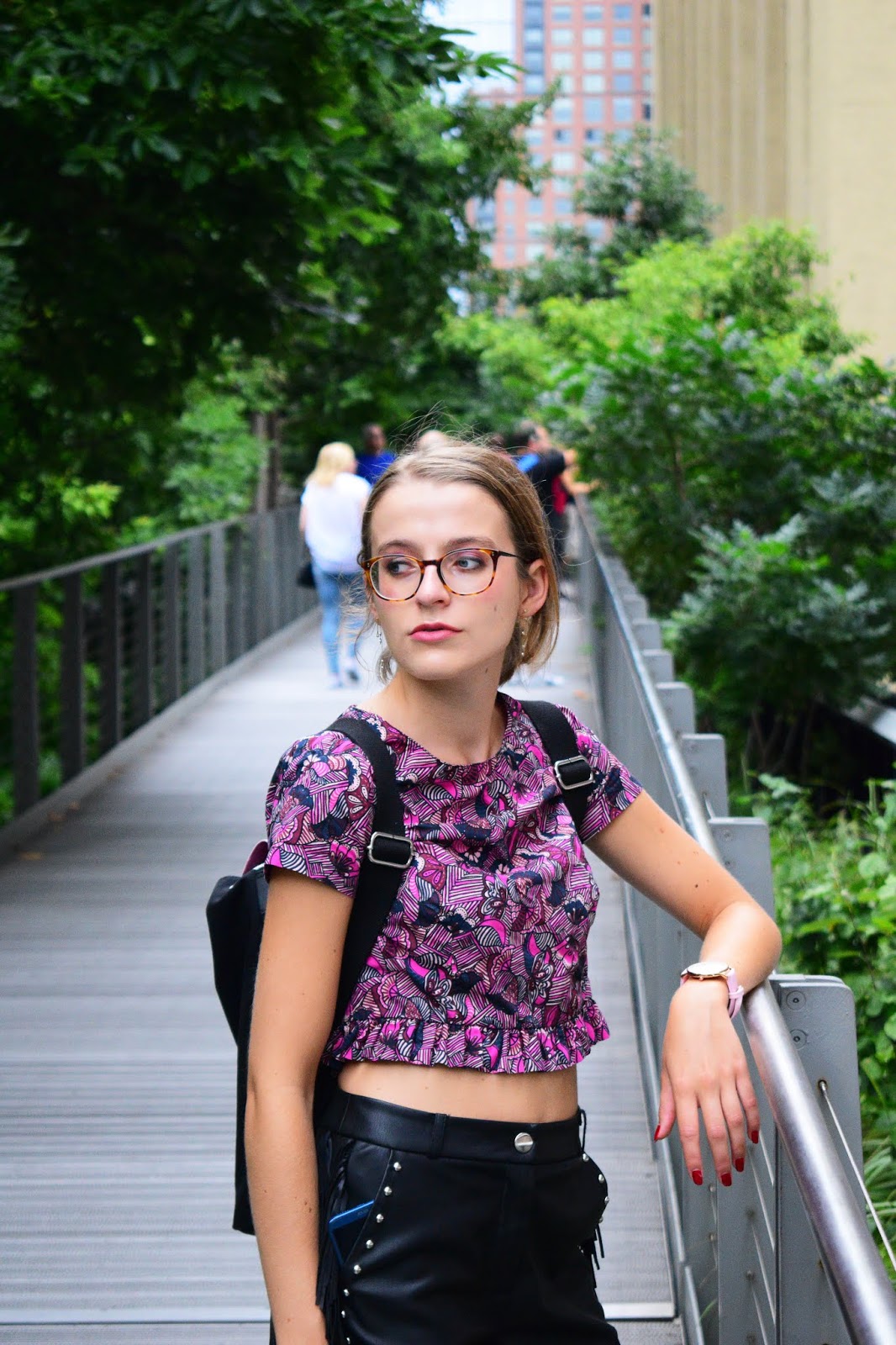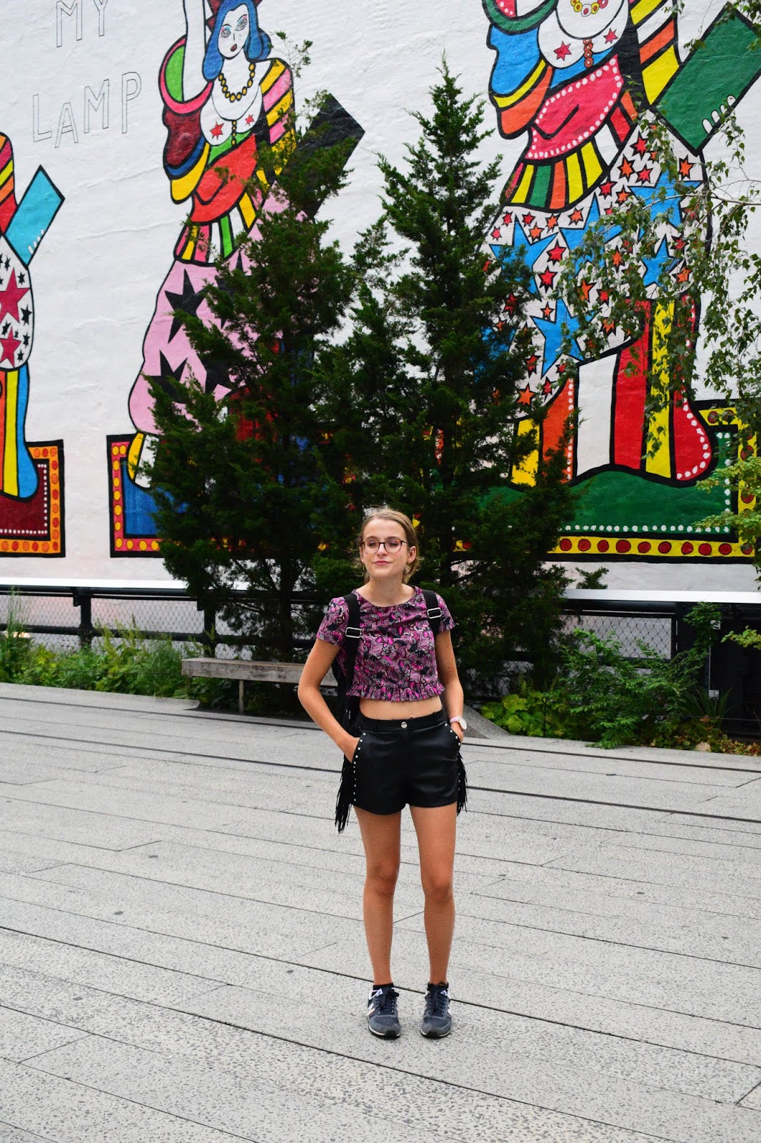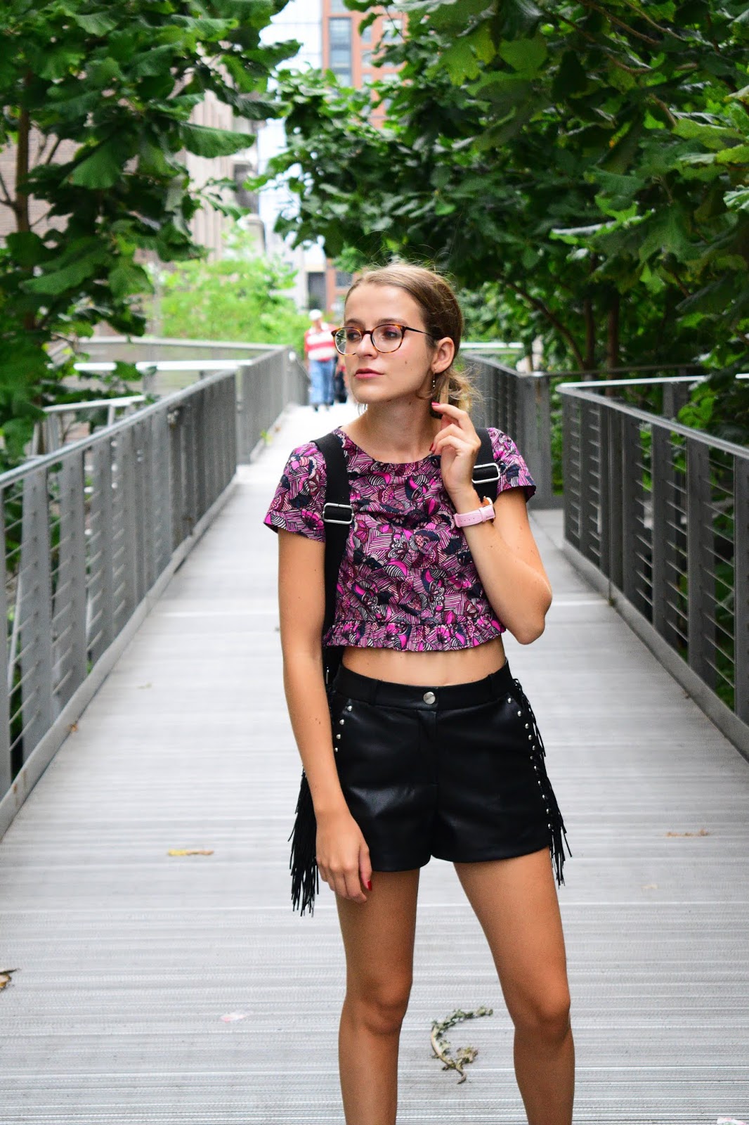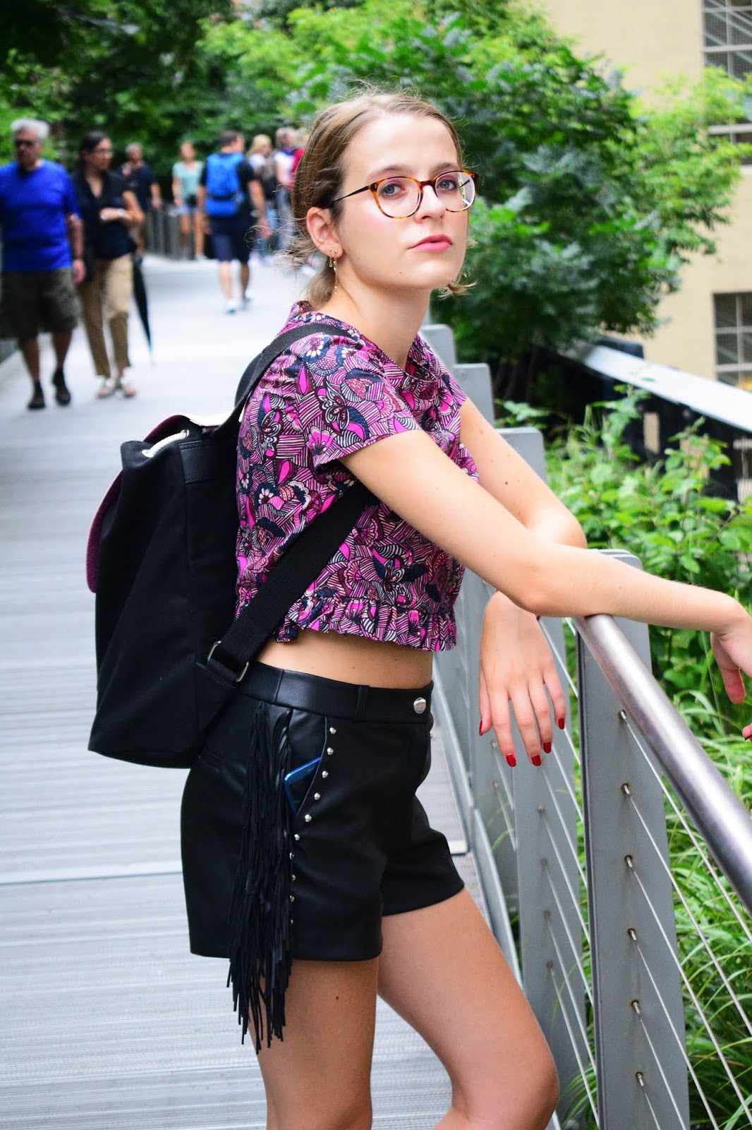 Nous avons pris cette série de photos sur la Highline, endroit vraiment super sympa situé à l’ouest de Manhattan. Il s’agit en fait d’une promenade de 2.4km de long, sur les anciens rails désaffectés d’une voie de chemin de fer. Cette promenade se situe sur les toits entre Chelsea et le Meatpacking District. C’est très vert, très bien entretenu, il y a peu de monde le matin, c’est très agréable ce mélange de verdure et de buildings autour de vous, puisque vous marchez entre les buildings ce qui est assez incroyable. Du coup comme tous les autres jours quasiment, je portais ma paire de baskets afin de pouvoir cavaler de partout à l’aise. Avec, j’ai souhaité quelque chose d’assez féminin. Avant de partir j’avais associé ce short à franges ainsi que ce haut wax de chez Zara et j’aimais plutôt pas mal l’association.