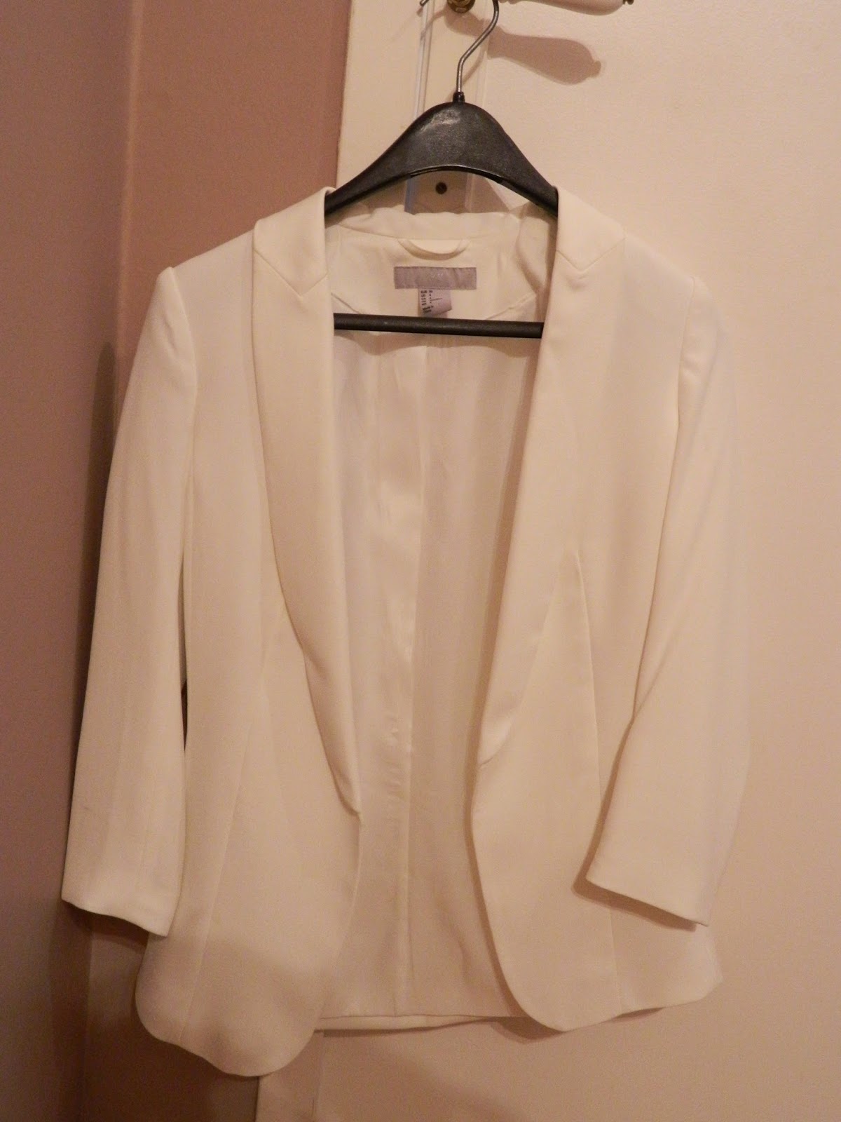 Je suis on ne peut plus fière de ma nouvelle trouvaille immaculée. La veste blanche, tout comme la veste noire ou la petite robe noire (PRN) ou petite robe blanche (PRB), sont indéniablement des basiques au même titre qu’un bon jean et j’en passe. Vous m’avez souvent vue avec des pièces colorées, funky, ne manquant pas d’originalité. C’est toujours d’actualité, mais j’avoue ne pas renier un joli basique. Parce qu’un petit short funky ( mon nouveau Zara que je compte vous montrer un jour, promis), passe très bien accompagné d’une jolie petite veste blanche. J’étais donc à la recherche d’un blazer, genre smoking immaculé. Jusque-là, impossible de trouver ce que je cherchais. Jusqu’à ce mardi soir en faisant un tour chez notre géant suédois avec une amie. Une petite escapade rapide avant de se faire un ciné (American Nightmare 2). Je tombe soudain sur ce joli blazer. Exactement le genre que je cherchais. Je suis ravie de ma trouvaille. Elle habille un look à elle seule.