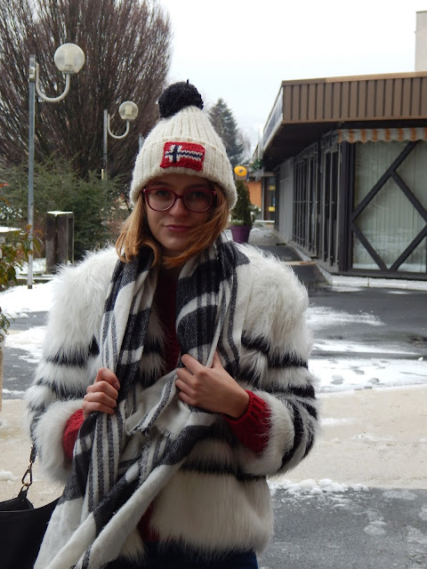 Un look shooté un jour de neige froid. Il fallait donc s’habiller en conséquence. Le faux fur a donc été la solution ainsi que le gros bonnet Napapijri, l’écharpe plaid et les UGG afin d’avoir les pieds au chaud et marcher tranquillement dans toute cette neige. Un look assez simple,