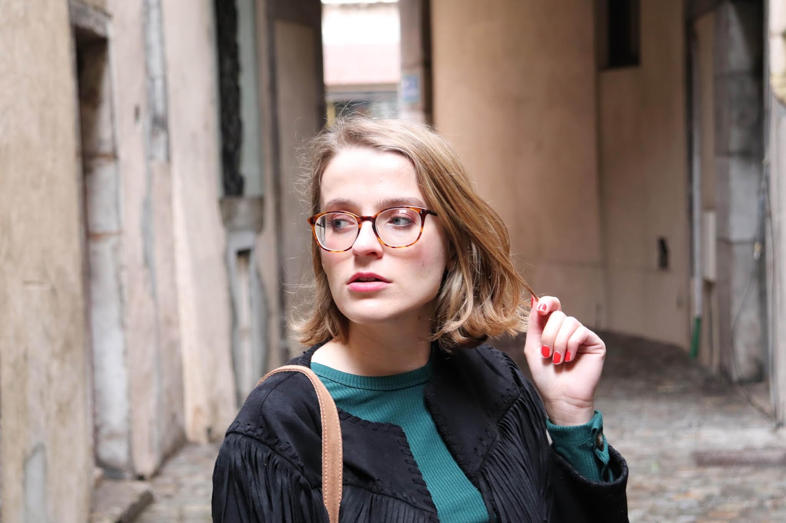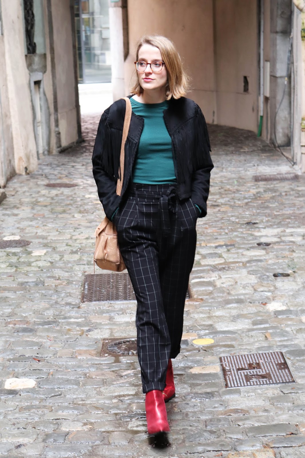 Une tenue quasiment entièrement composée de pièces Stradivarius, n’ayant même pas fait exprès. Je porte ma nouvelle veste frangée en suédine commandée début mars sur le site. Stradivarius est vraiment une marque que j’aime beaucoup. Ils possèdent des pièces vraiment fashion, à prix vraiment abordables. Cette petite veste quand je l’ai vue j’ai vraiment flashé dessus, adorant les franges. J’en avais une camel mais pas de noire qui va pourtant avec tout. C’était l’occasion et j’en suis ravie. Avec, je porte ce petit haut acheté en soldes, déjà porté dans ce look .