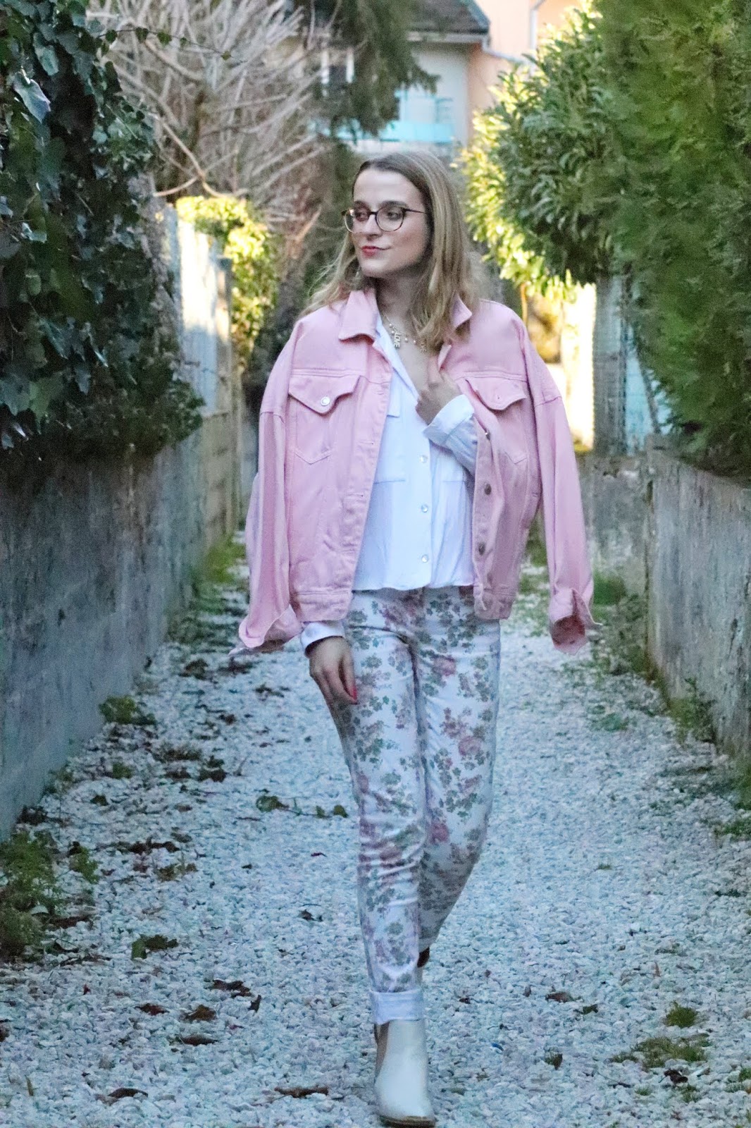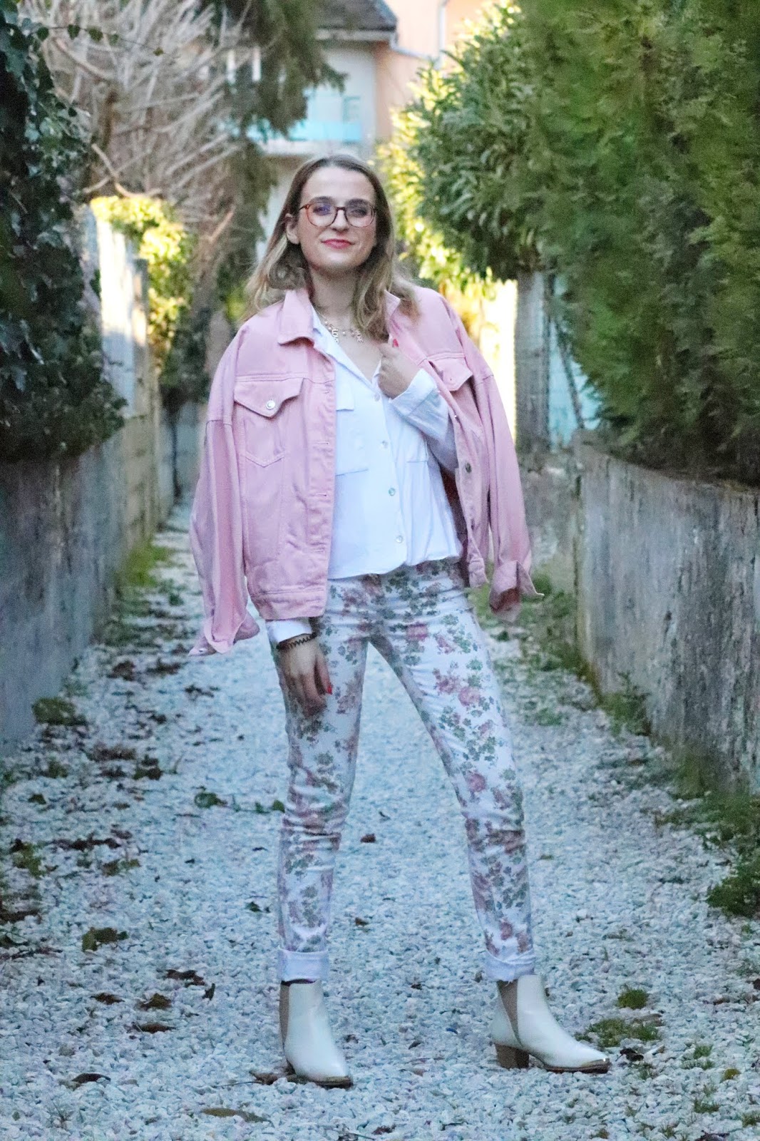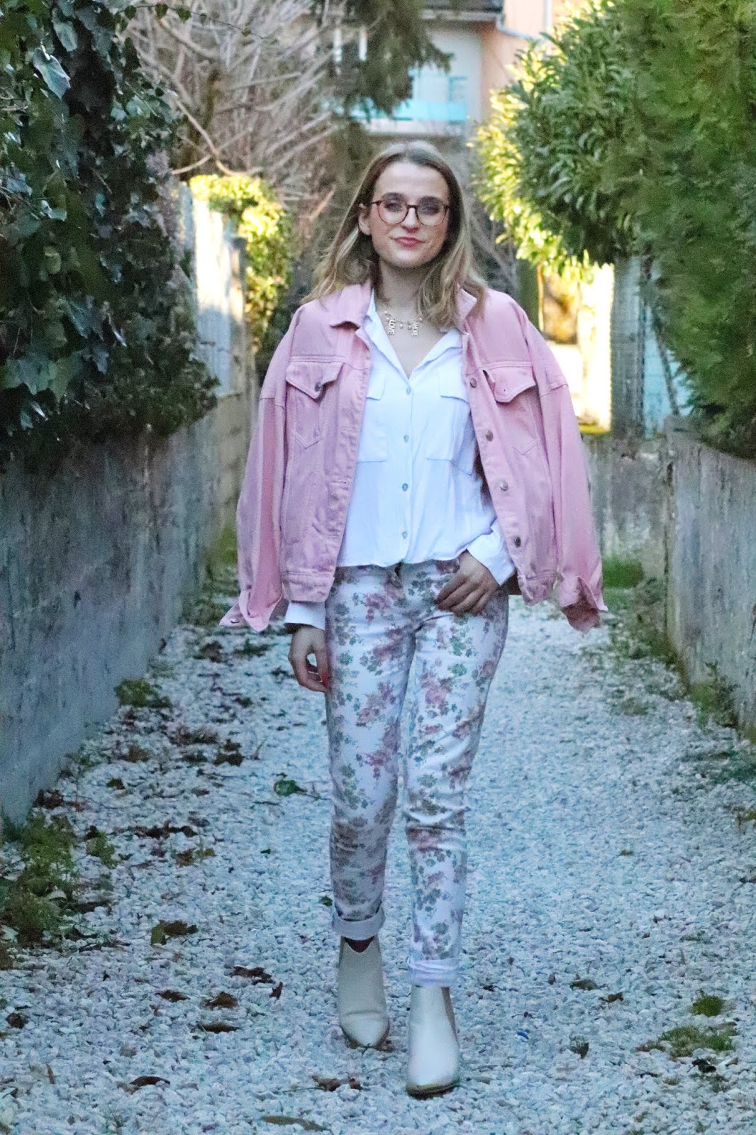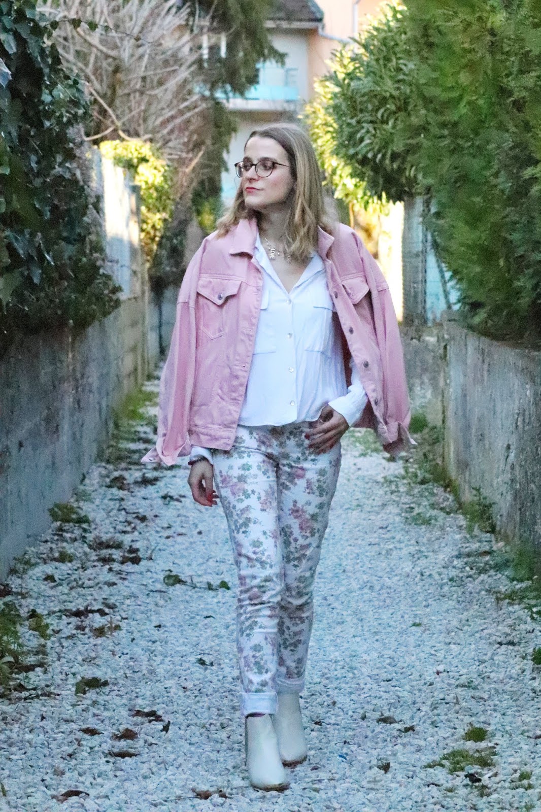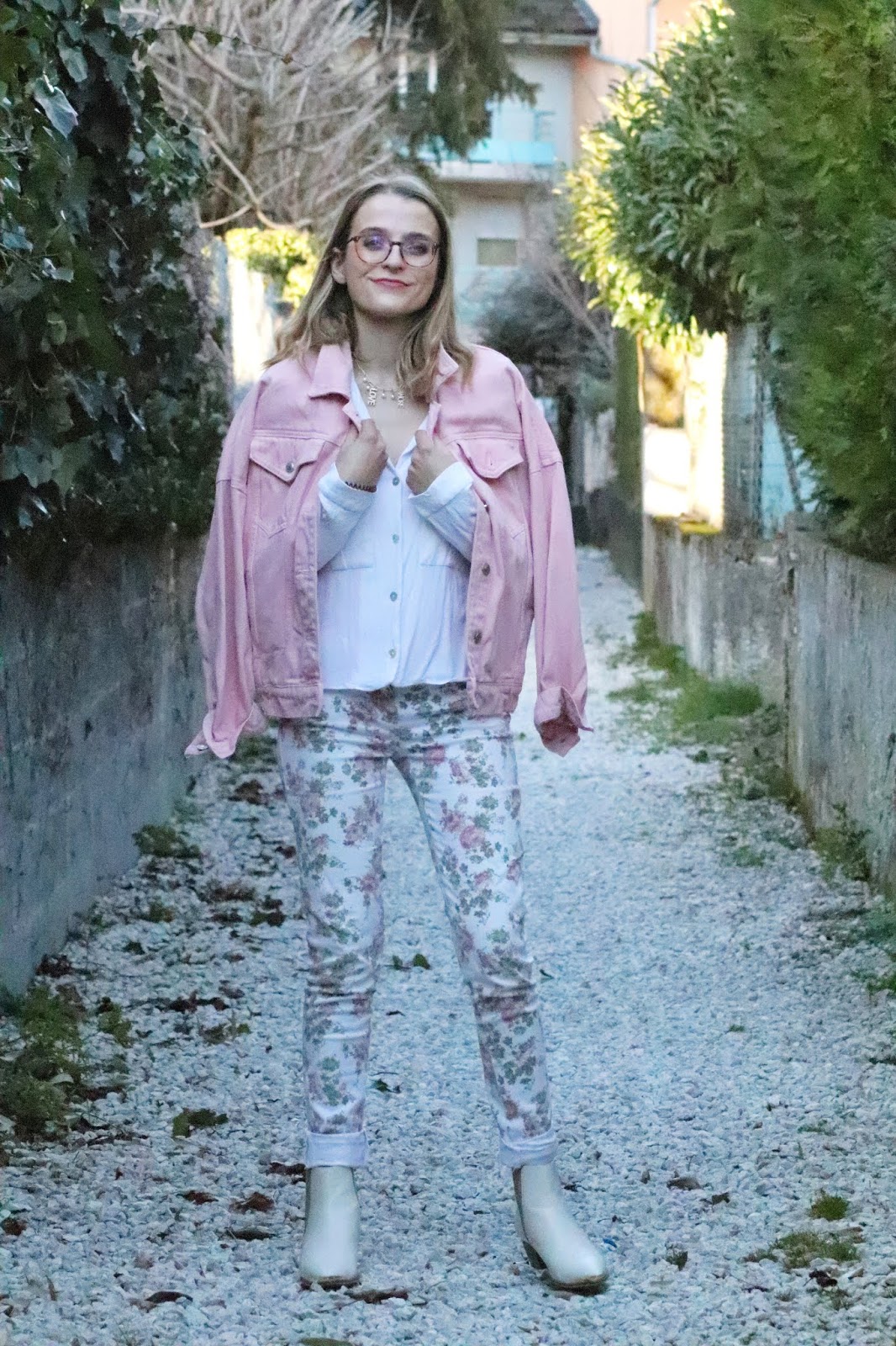Un petit look bien printanier en ce milieu de semaine, faut dire que les températures étaient beaucoup trop agréables pour se priver de porter des tenues plus légères. Il faisait quasiment 20 degrés chez nous ce qui est assez dingue faut le dire… J’avais trop envie de ressortir cette veste en jean oversize rose shoppée l’année dernière chez mon fournisseur officiel, Stradivarius. Mon jean fleuri que j’ai maintenant depuis des annééééées littéralement, mais que j’aime toujours autant. Mes bottines blanches pour encore plus forcer l’esprit printemps et puis voilà! J’espère que ces photos faites par mon amie Kelly vous plairont!