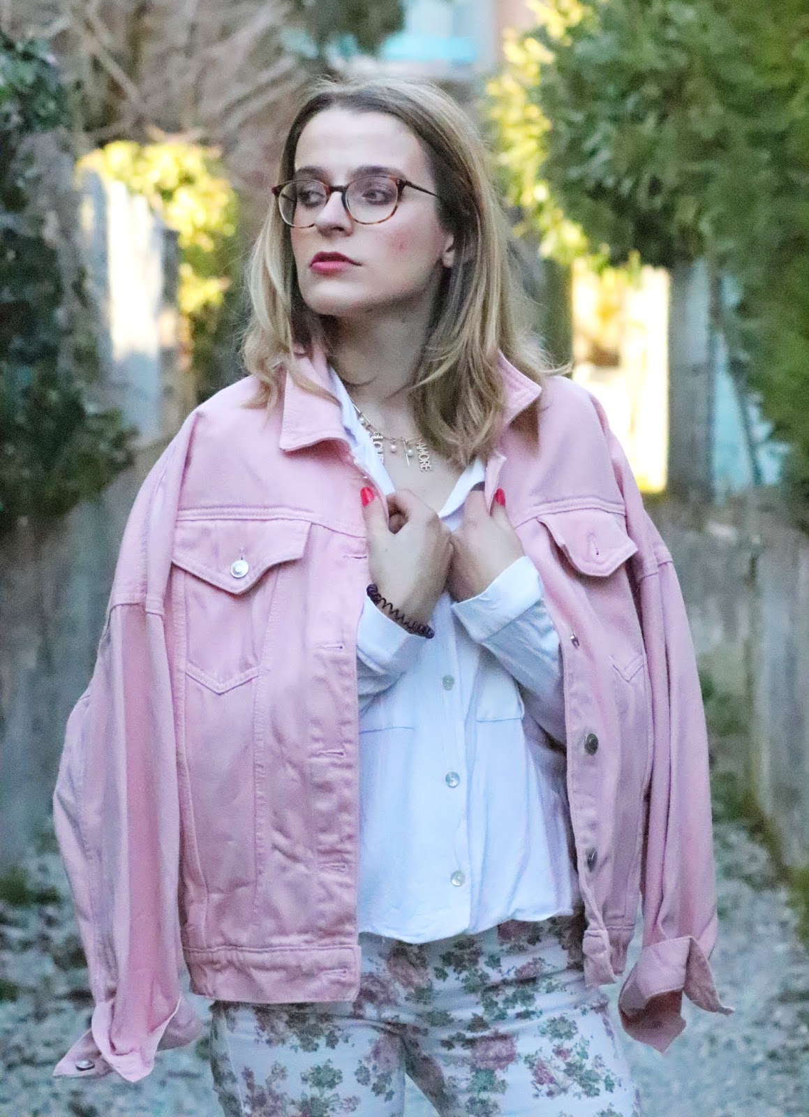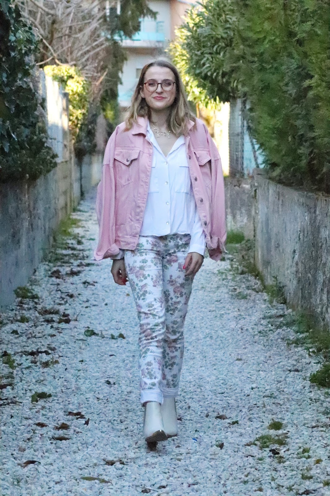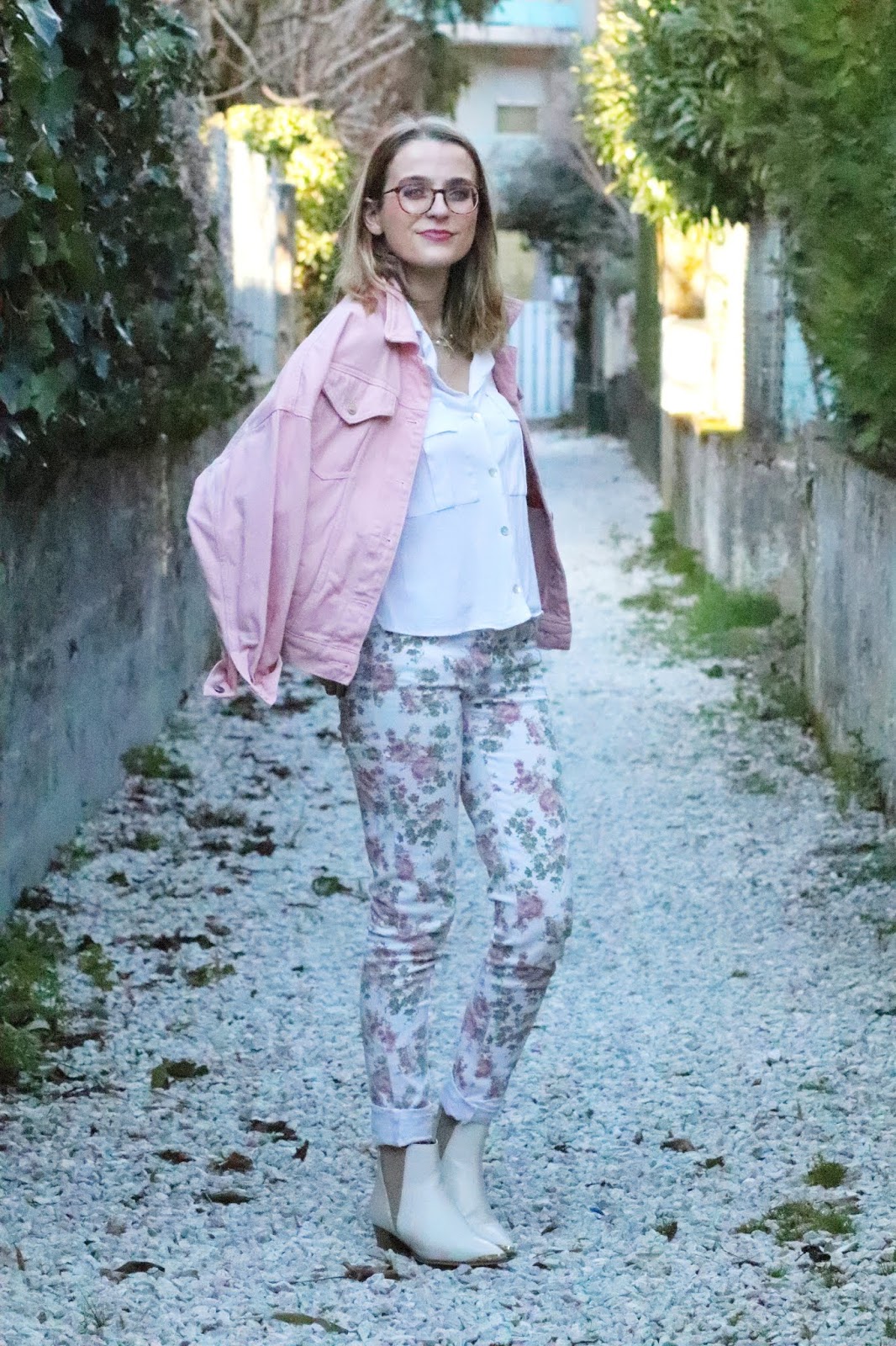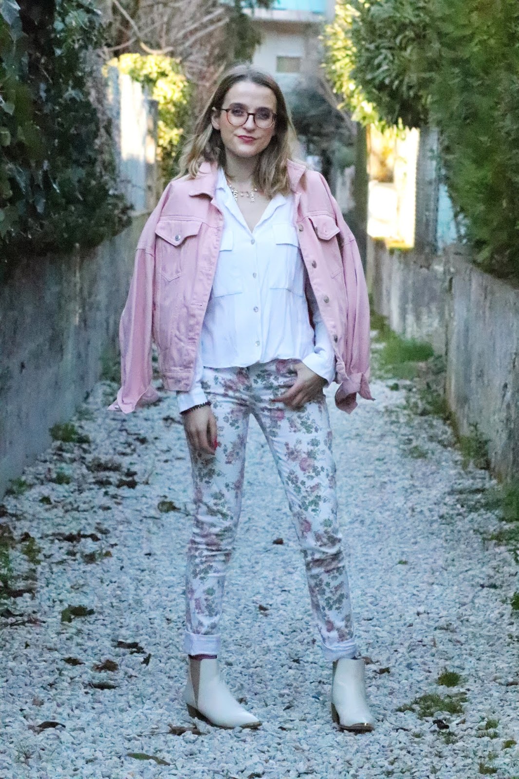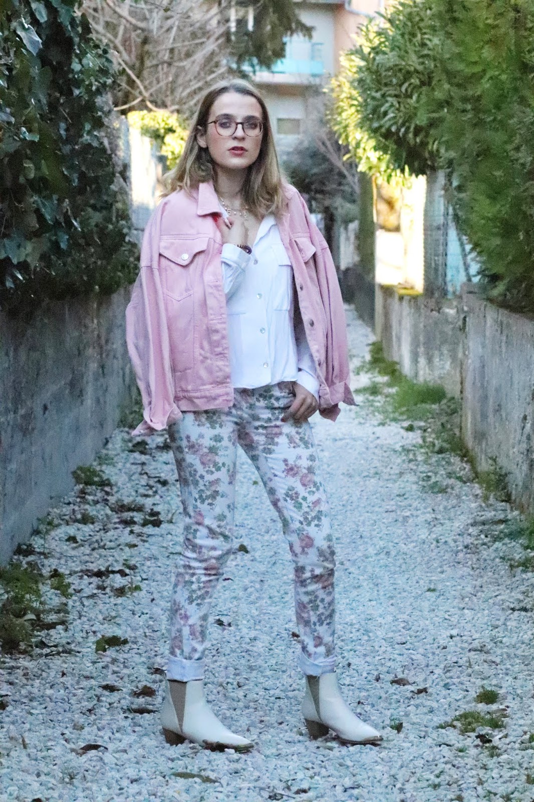 Un petit look bien printanier en ce milieu de semaine, faut dire que les températures étaient beaucoup trop agréables pour se priver de porter des tenues plus légères. Il faisait quasiment 20 degrés chez nous ce qui est assez dingue faut le dire… J’avais trop envie de ressortir cette veste en jean oversize rose shoppée l’année dernière chez mon fournisseur officiel, Stradivarius. Mon jean fleuri que j’ai maintenant depuis des annééééées littéralement, mais que j’aime toujours autant. Mes bottines blanches pour encore plus forcer l’esprit printemps et puis voilà! J’espère que ces photos faites par mon amie Kelly vous plairont!