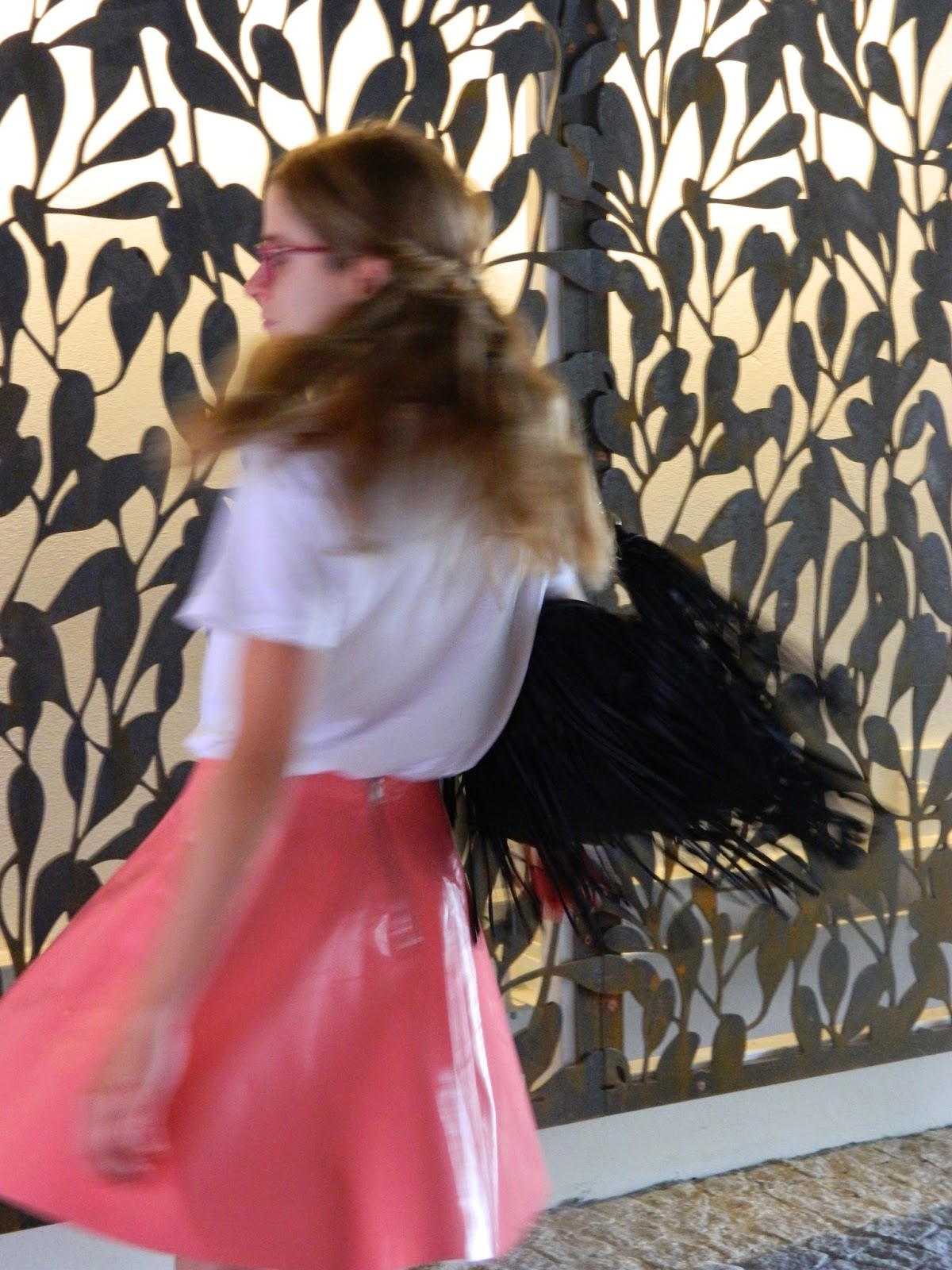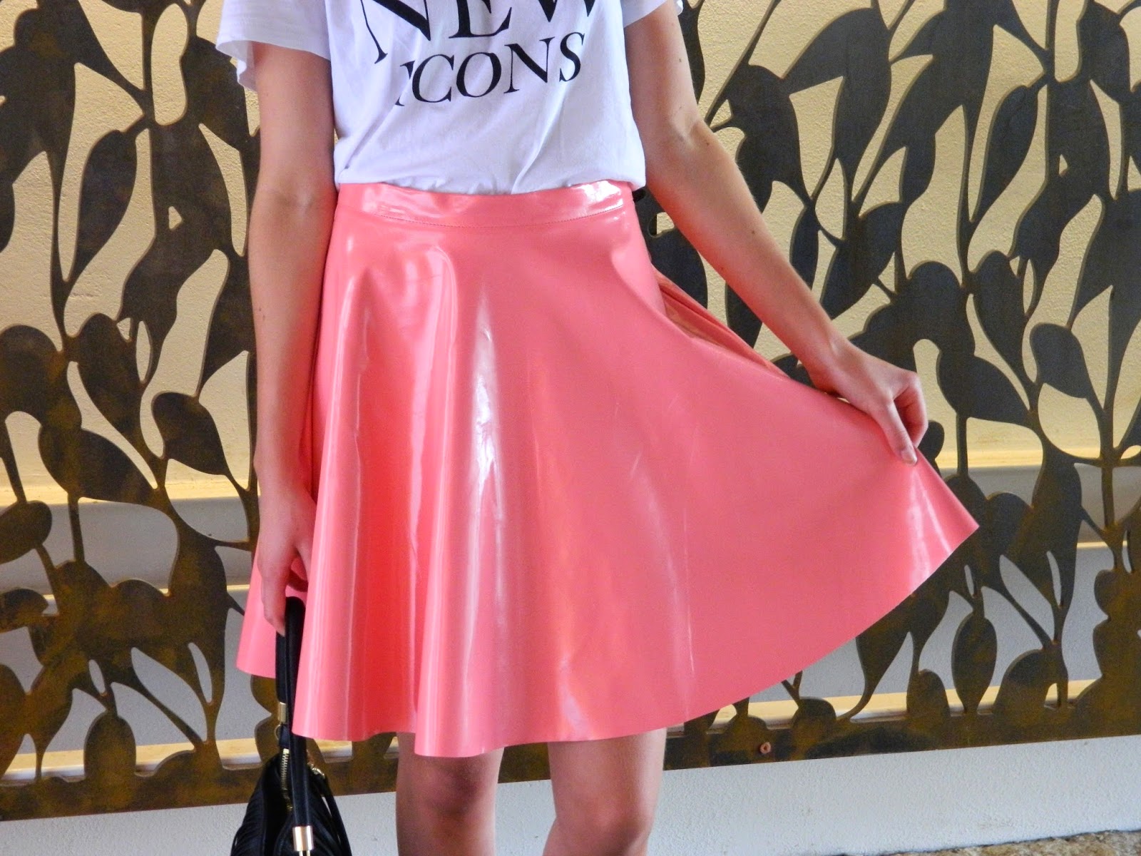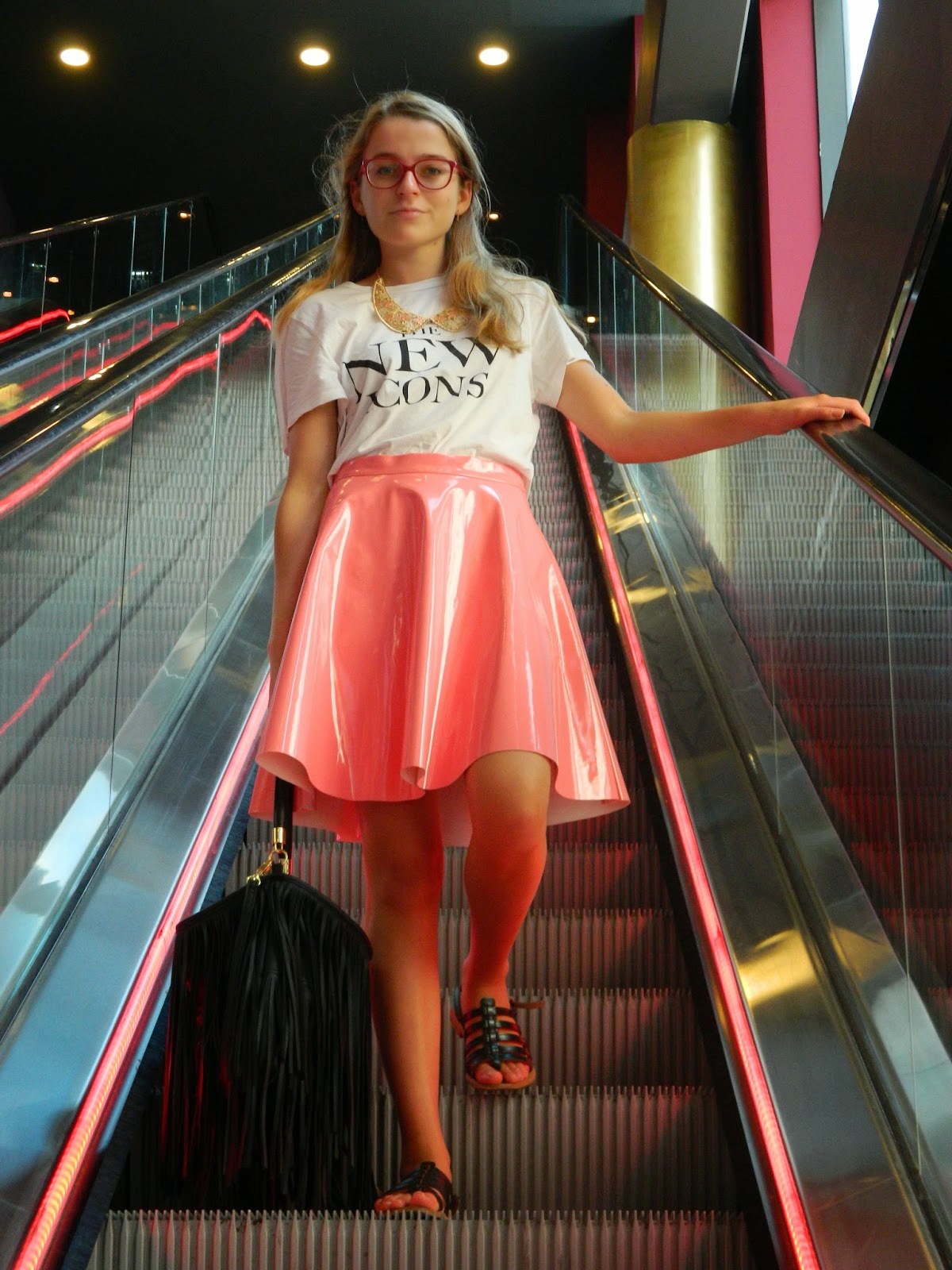 Inaugurer ma jupe en vinyle rose n’est pas chose facile. A associer, et pour sortir avec dans la rue. Bien que je ne sois pas une peureuse au niveau des réactions des gens très souvent pénibles, je savais que cette jupe attirerait les regards. Pourtant lors de sa sortie, ça s’est plutôt bien passé, je ne peux qu’être contente. Il faut dire que j’ai essayé de la jouer light. Mon teesh New Icons, assez mec, et des accessoires noirs. J’ai juste ajouté mon collier dans les mêmes tonalités de ma jupe et afin de féminiser mon teesh. De jolis décors pour ce nouveau look. Un nouveau passage accessible depuis peu, et dans les escalators du cinéma.