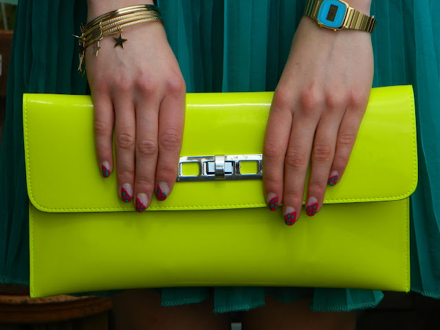 Robe: Asos; Collier: Barcelone; Headband: Bijoux Brigitte; Pochette et escarpins: Pimkie; Montre: Casio; Bracelets: H&M; Vernis rouge senteur fruits rouges: Rimmel; Vernis vert: Gemey Maybelline coloris Greenwich.