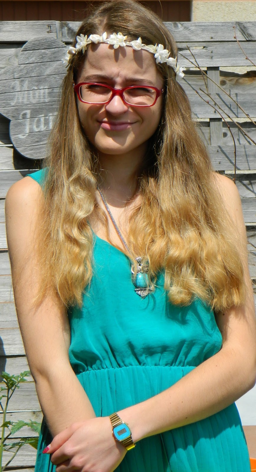 Samedi, c’était le mariage de ma tante et pour l’occasion j’ai ressorti ma robe verte que je portais ICI. Je voulais une tenue colorée, un peu comme d’hab quoi, et du coup j’ai quasiment fait la même tenue que celle de mon anniversaire, sans les collants roses. Il faut pas déconner quand même. Donc pas de rose mais du vert et du jaune fluo. C’est déjà pas mal. Bon no comment sur ma tête, j’avais le soleil en pleine face donc essayez de passer outre. Pour un mariage, mon headband fleuri ne me quitte désormais plus et pour l’occasion c’était pas mal. J’ai gardé mes escarpins de 10 toute la soirée et inutile de vous dire que j’ai eu une ampoule.