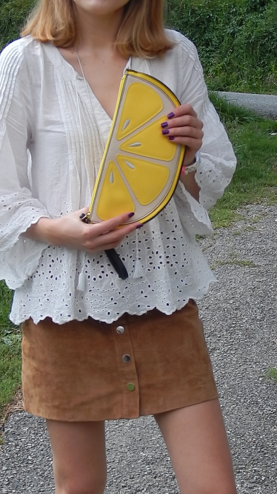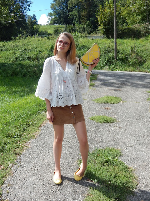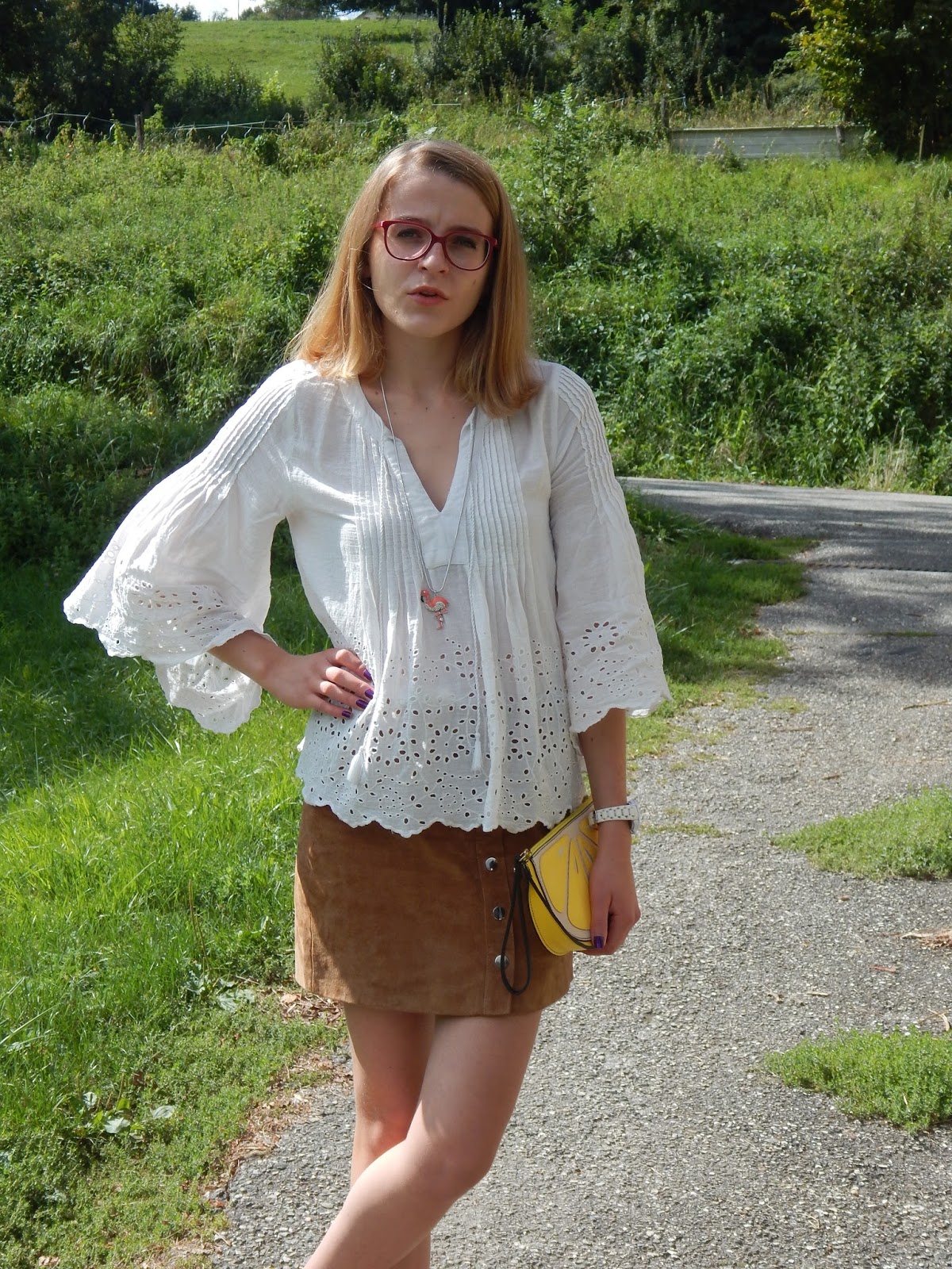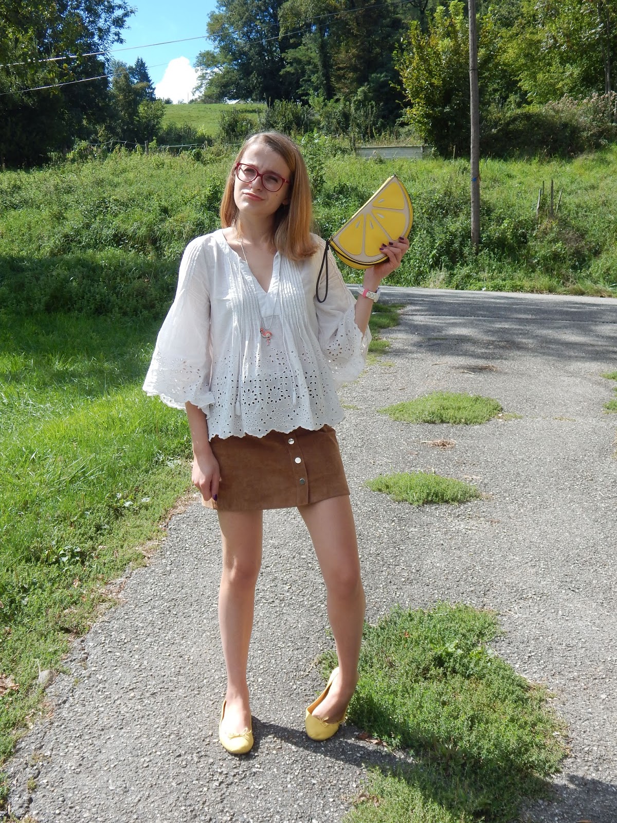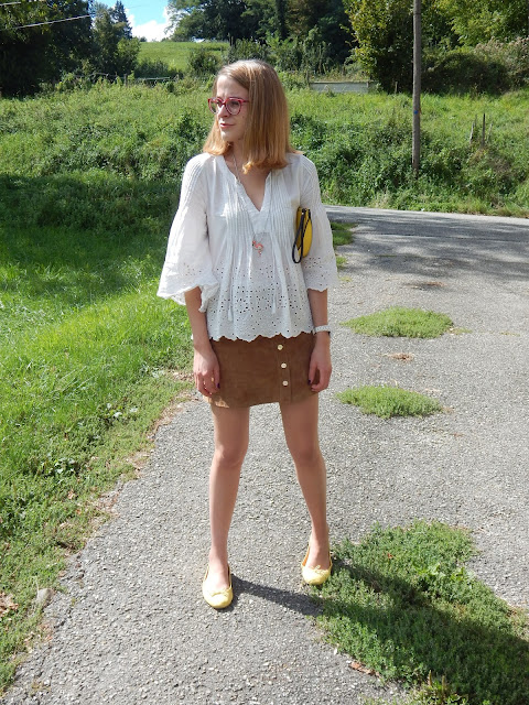 Blouse/Shirt: Zara; Collier/Necklace: Bizzbee; Pochette/Clutch: New Look; Jupe/Skirt, Ballerines/Shoes: Pimkie